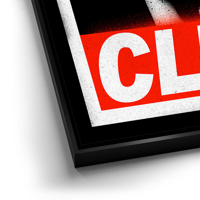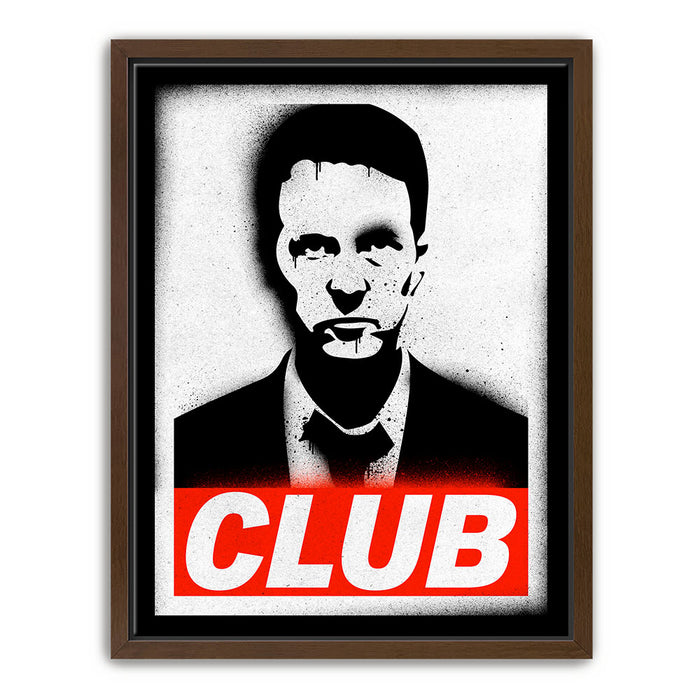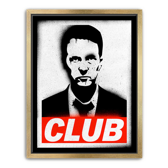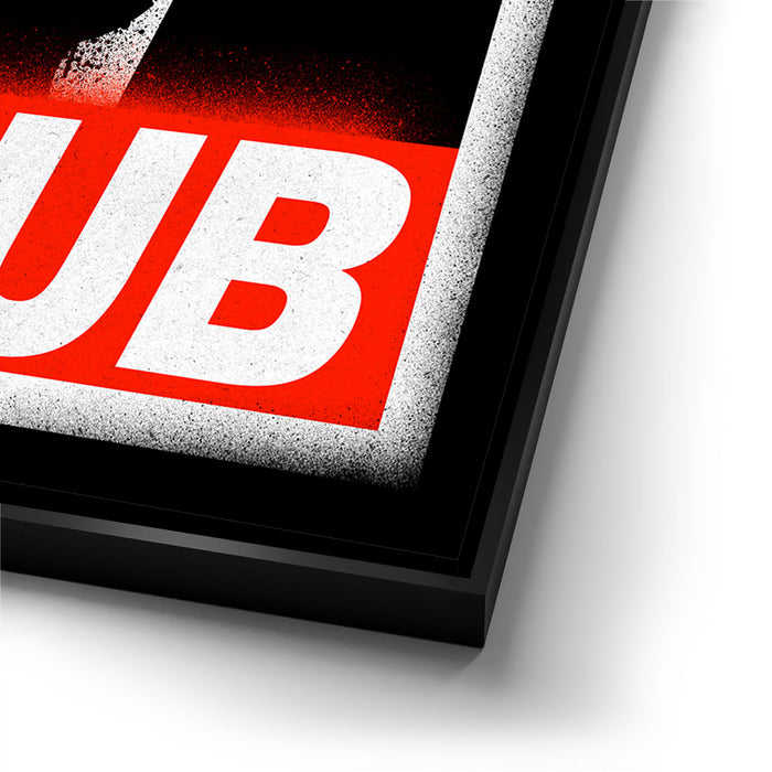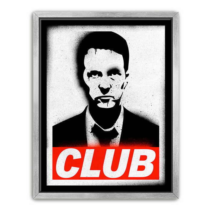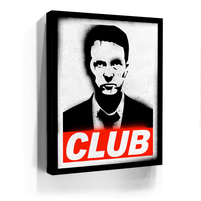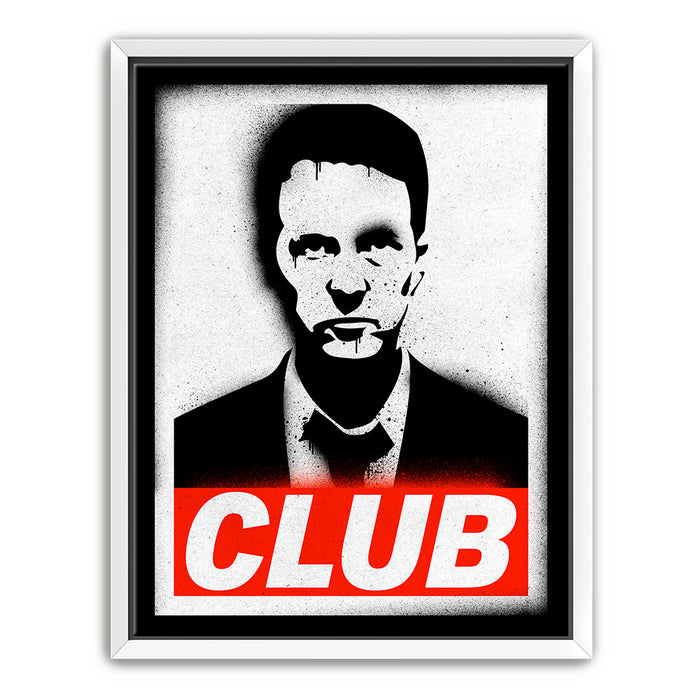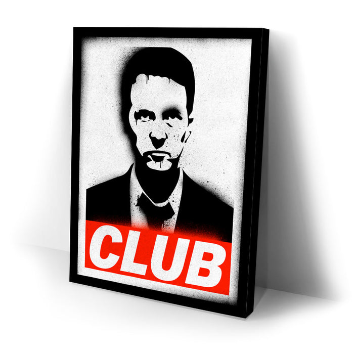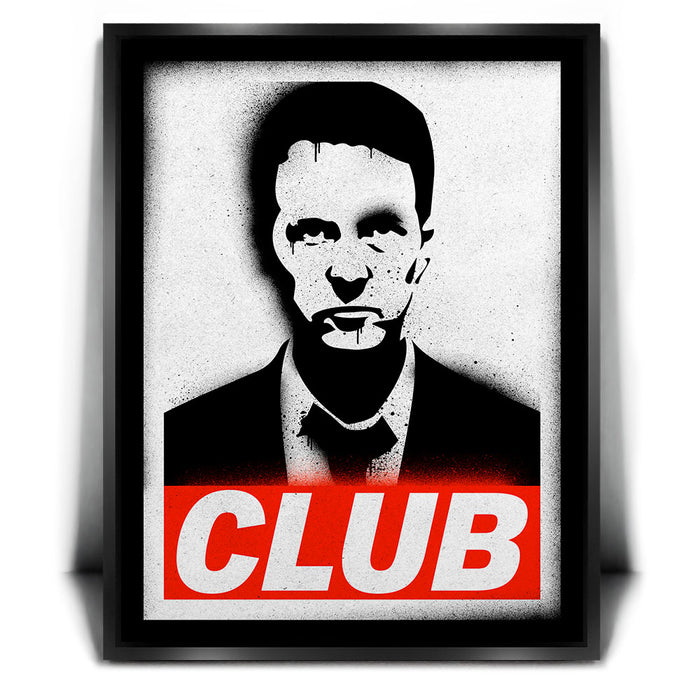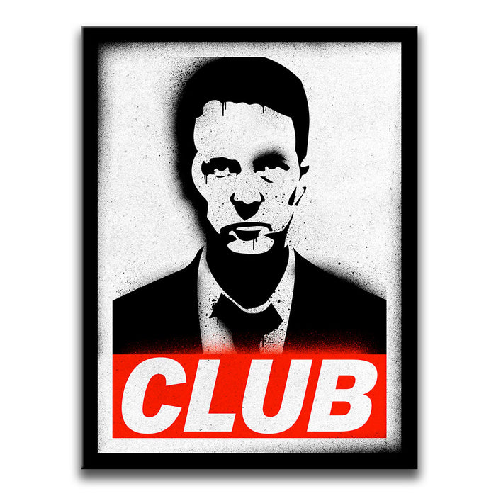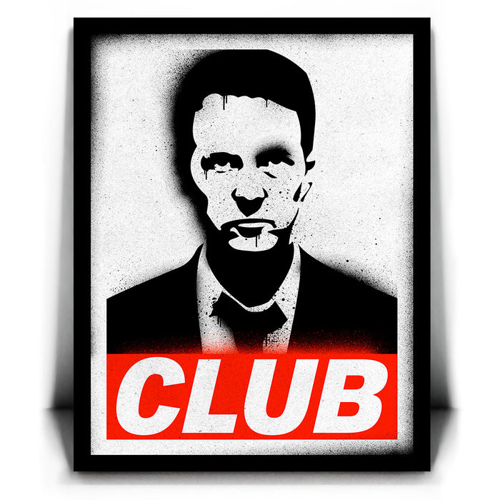 This striking artwork, titled "The Narrator - Club," pays homage to the cult classic movie Fight Club. Featuring a bold, stencil-style portrait of The Narrator, played by Edward Norton, the piece captures the gritty and intense atmosphere of the film. The stark black and white design, contrasted with a vibrant red accent, adds to the powerful visual impact, making it a must-have for fans of 90's movies and pop culture.