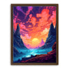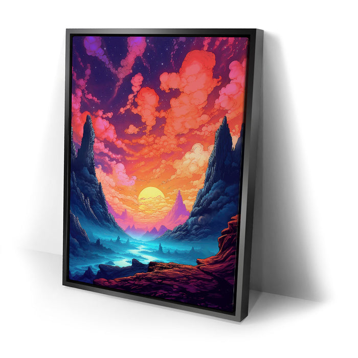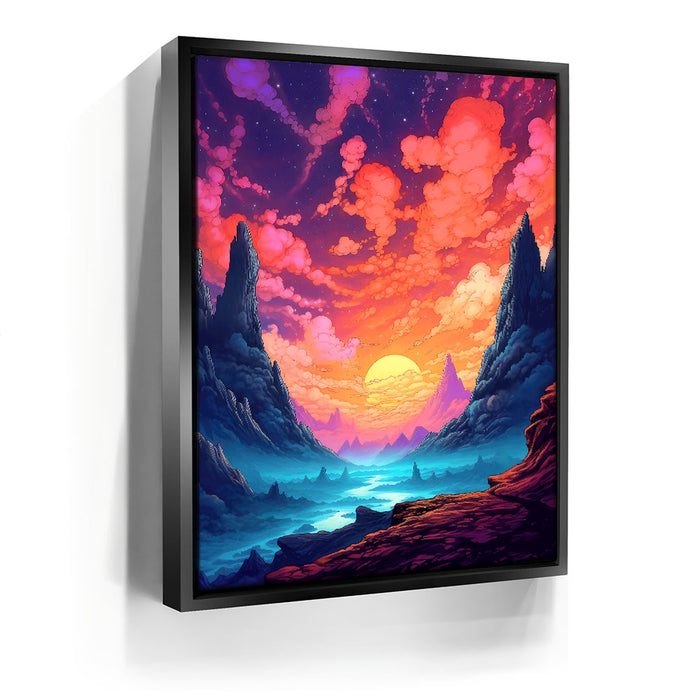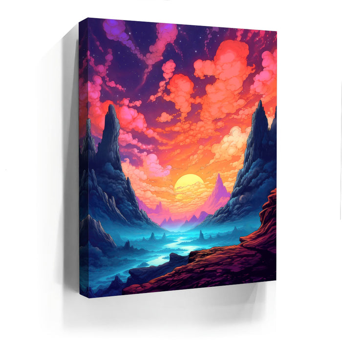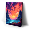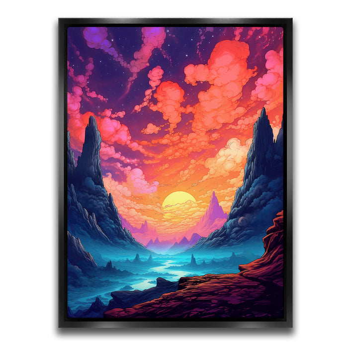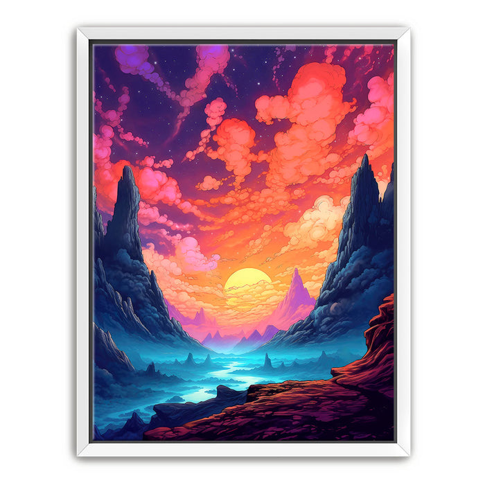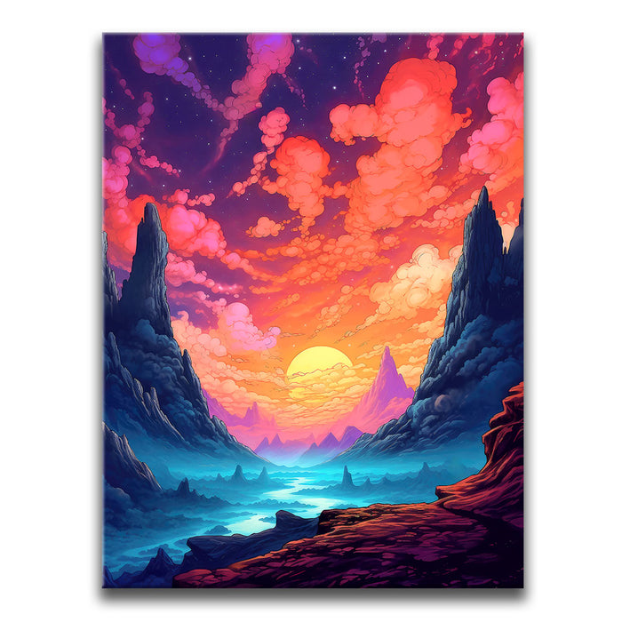 "The Path Less Taken" by Midjourney.Man is a stunningly vibrant and surreal landscape that invites the viewer into a world of wonder and exploration. The piece features towering cliffs framing a serene valley, where a glowing sun dips below the horizon, casting hues of pink, purple, and orange across the sky. The winding path through the misty, otherworldly terrain suggests an epic journey, while the bold, rich colors evoke a sense of mystery and adventure.