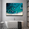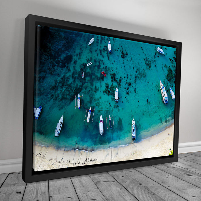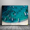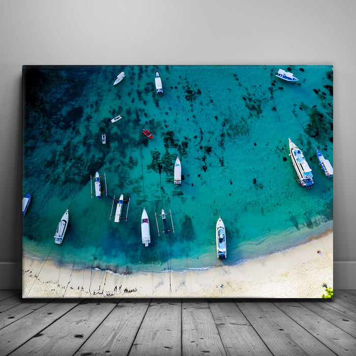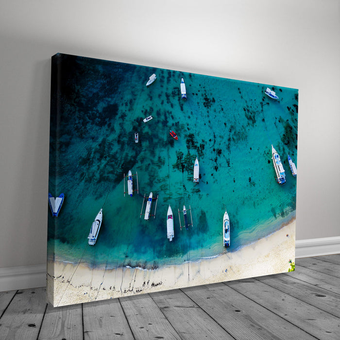 "The Red One" by photographer Scott Shute captures an aerial view of boats anchored in the clear turquoise waters off the coast of Bali, Indonesia. Among the various vessels, a single red boat stands out against the serene blue-green sea, adding a striking focal point to the tranquil composition. This piece highlights the beauty of simplicity and contrast, evoking a sense of calm while celebrating the vibrant spirit of Bali's coastal life.