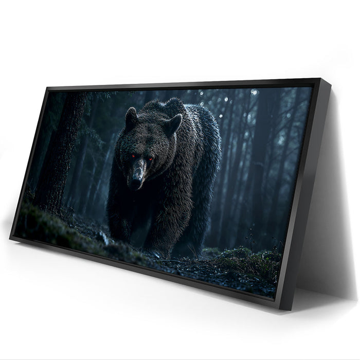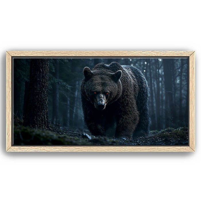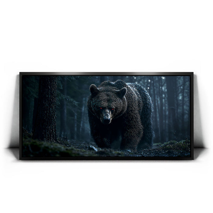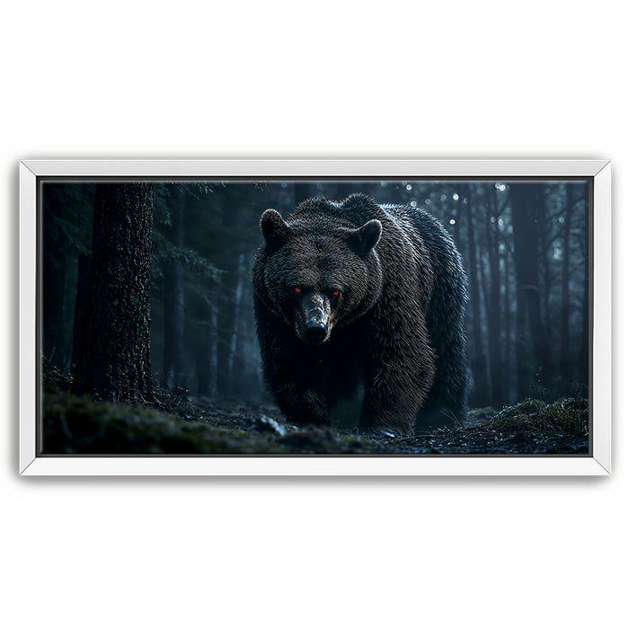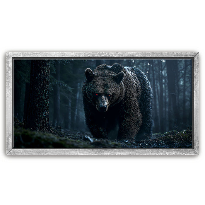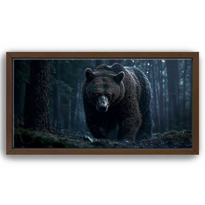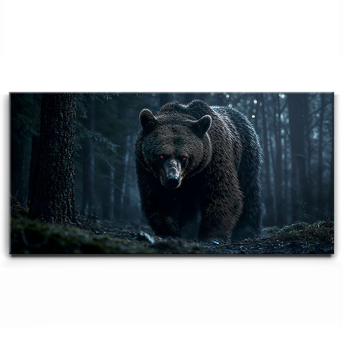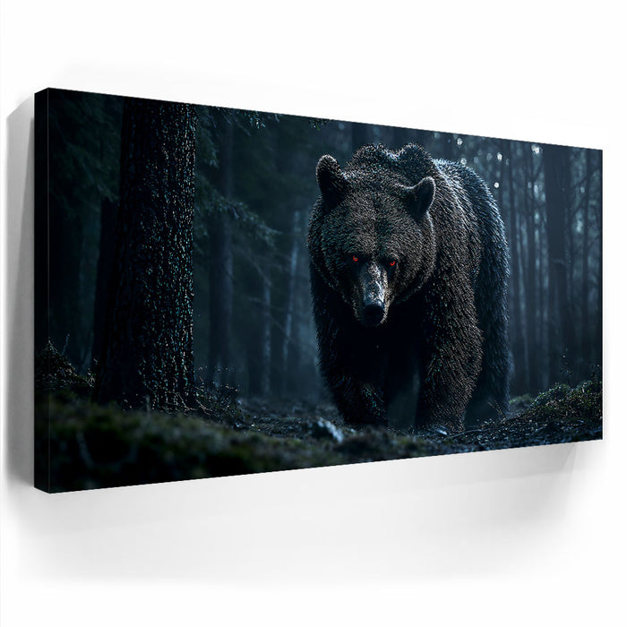 "The Shadow Of The Forest" by Midjourney.Man is a captivating digital masterpiece that brings to life the raw power and mystery of the wild. This artwork features a menacing bear with glowing red eyes, emerging from the dark depths of an enchanted forest, evoking an atmosphere of suspense and primal energy.