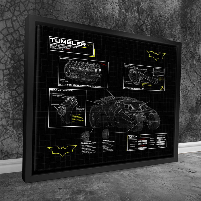 This piece is perfect for fans of *Batman*, superhero vehicles, and automotive art. Whether displayed in an office, gameroom, or movie-themed space, "The Tumbler Blueprint" brings the thrill of Gotham’s protector and his iconic car to any room. An essential piece for collectors of *Batman* memorabilia and lovers of superhero movies.