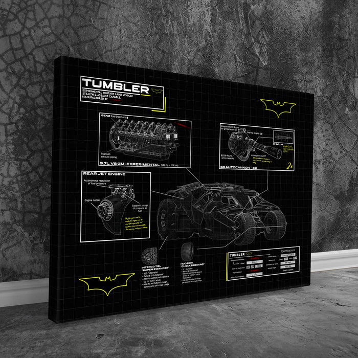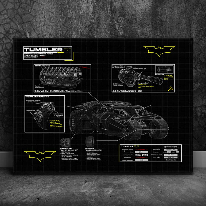 "The Tumbler Blueprint" is a detailed artistic rendering of Batman’s iconic vehicle, also known as the Batmobile. Inspired by *The Dark Knight* and *Batman Begins*, this blueprint artwork captures the intricate design and engineering of the Tumbler, complete with signature phrases like "Does it come in black?" and details that will excite any superhero or comic book fan.