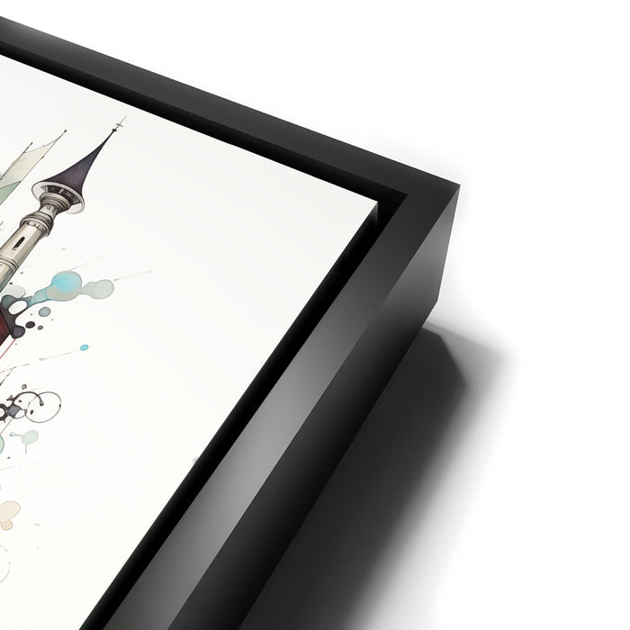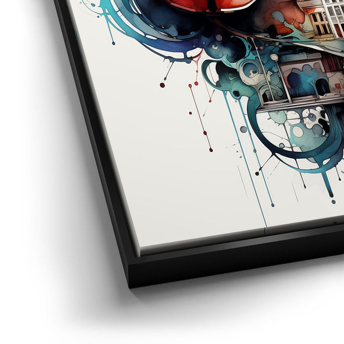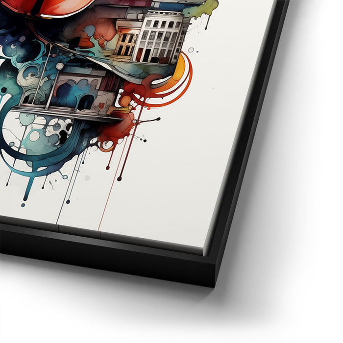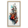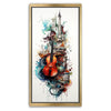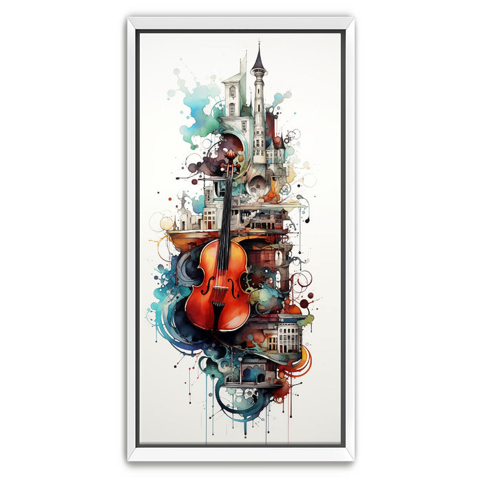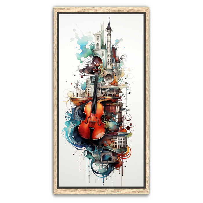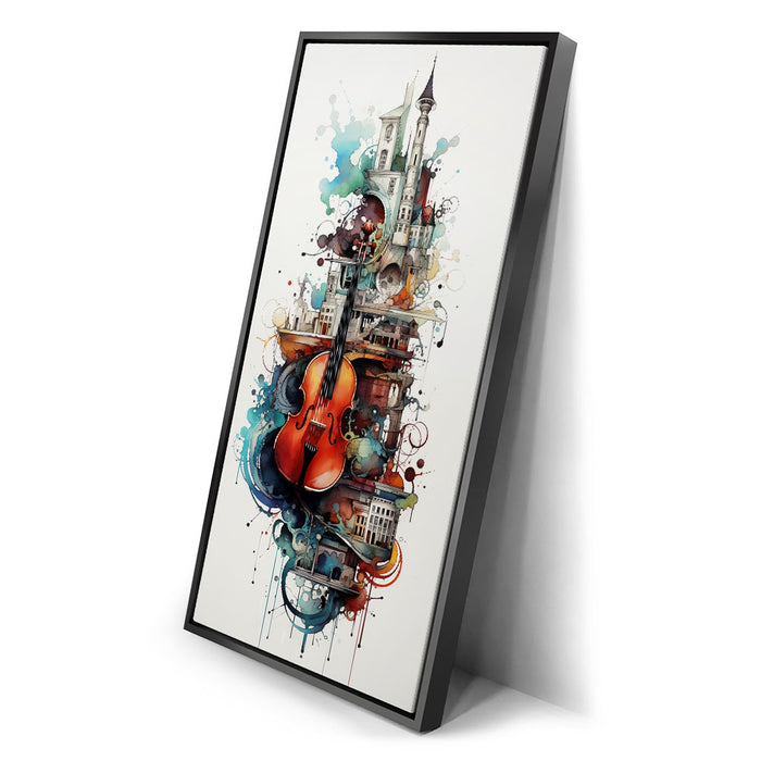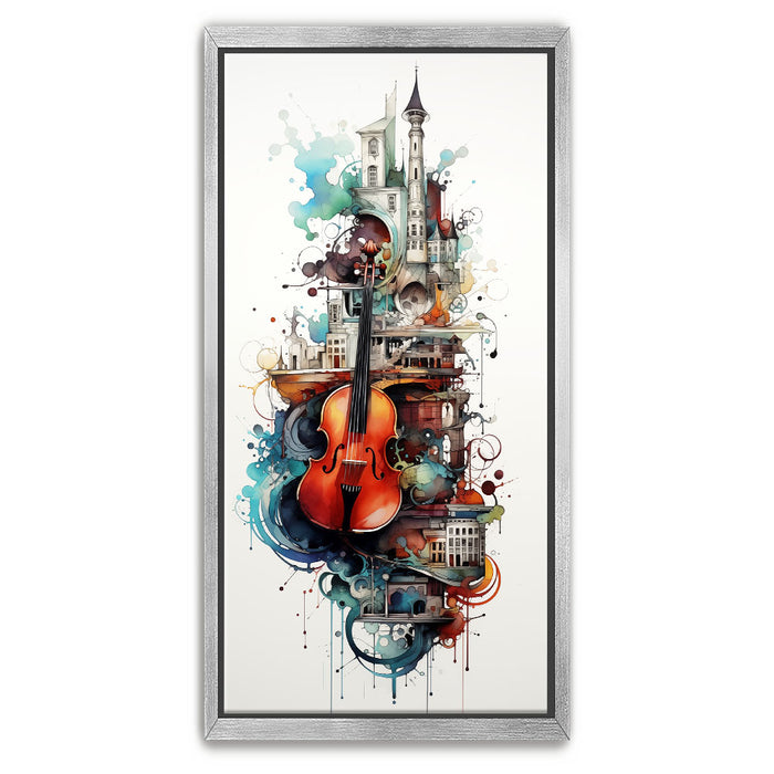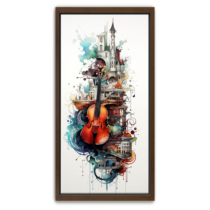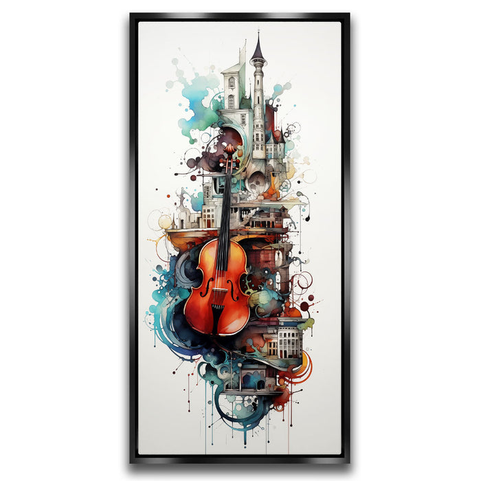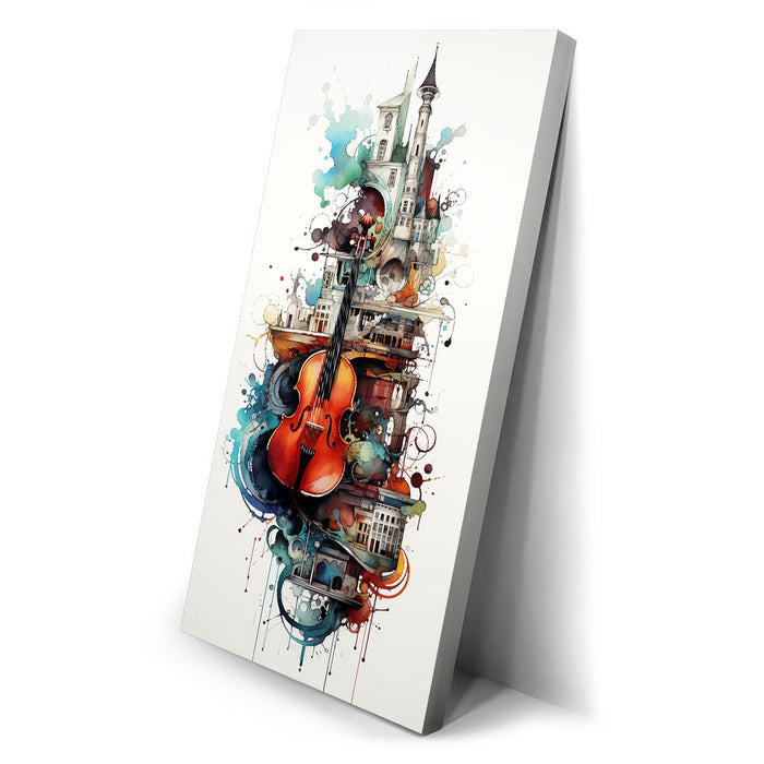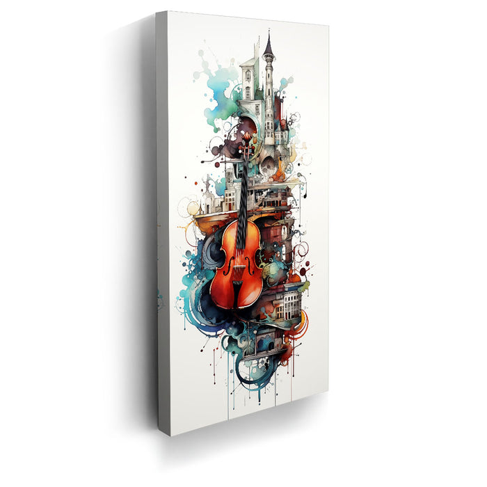 "The Violin's Journey" by Merrillio is a vibrant piece of abstract wall art that captures the essence of music through the lens of European villages and castles. With a bold blend of splatter and pop art styles, this portrait-oriented artwork combines musical instruments, specifically the violin, with graphic art elements. The piece’s dynamic color palette of brown, orange, gray, blue, and black creates a striking visual experience that resonates with music lovers and art enthusiasts alike.