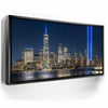 "Tribute in Light and 1 World Trade Center Panorama" by Barbarossa honors the resilience of New York City with a breathtaking night view. The illuminated One World Trade Center stands tall beside the twin beams of the Tribute in Light, symbolizing remembrance and strength against the glowing Manhattan skyline.
