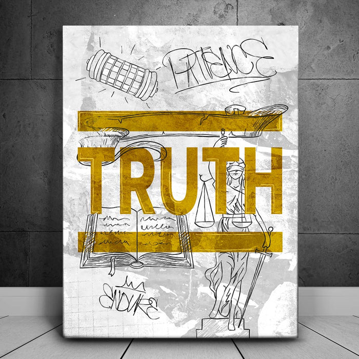 "Truth II - Sketch" is an inspiring piece that blends typography with a powerful message of patience and justice. Featuring a sketch of Lady Justice and the word "Truth," this artwork evokes themes of endurance, motivation, and the unwavering pursuit of truth. The typewriter-inspired typography adds a vintage touch, creating a timeless connection to justice and integrity.