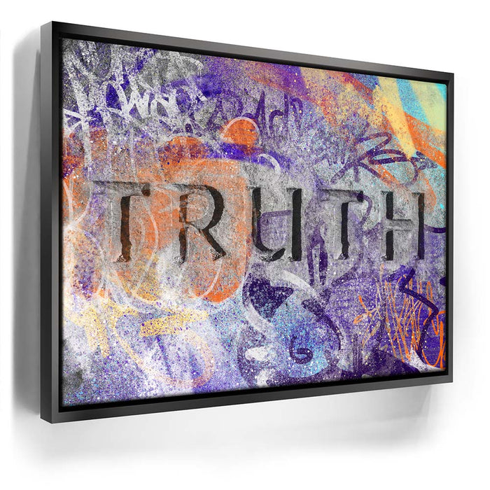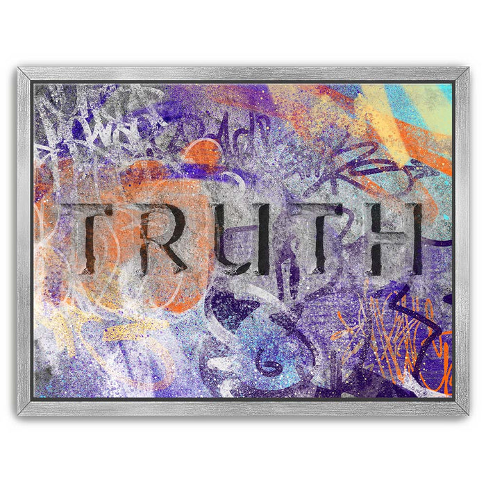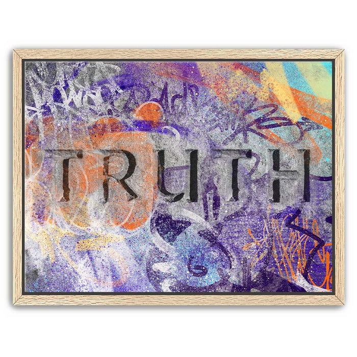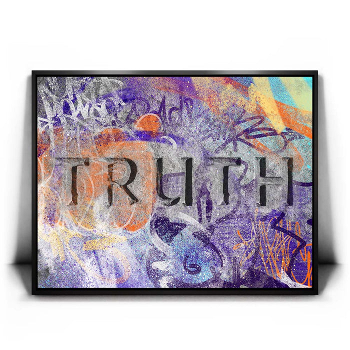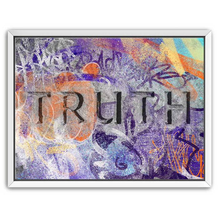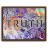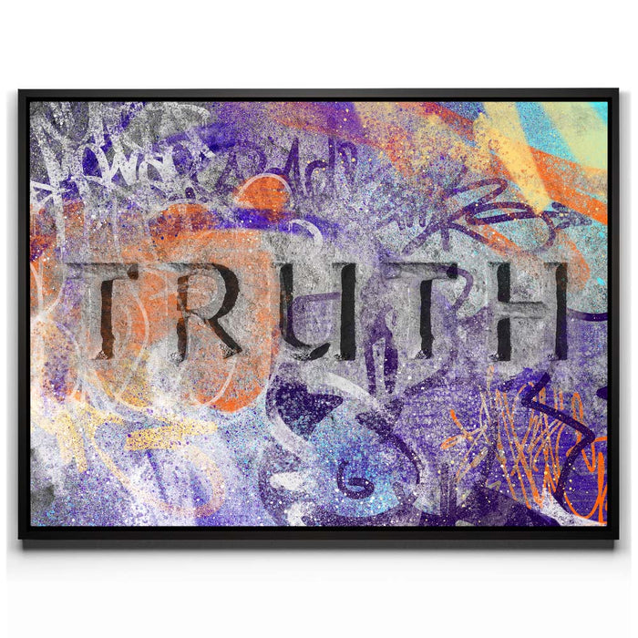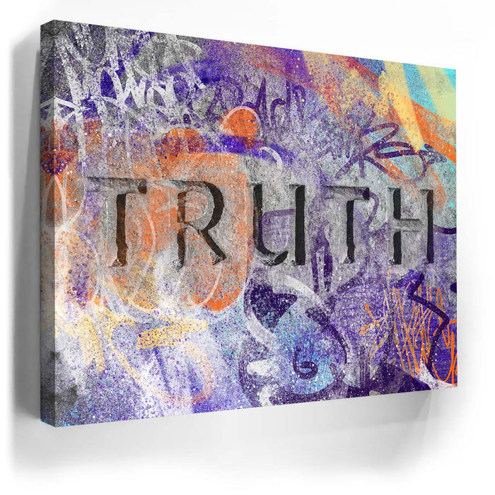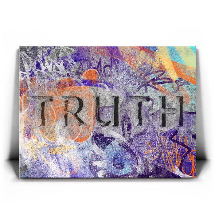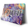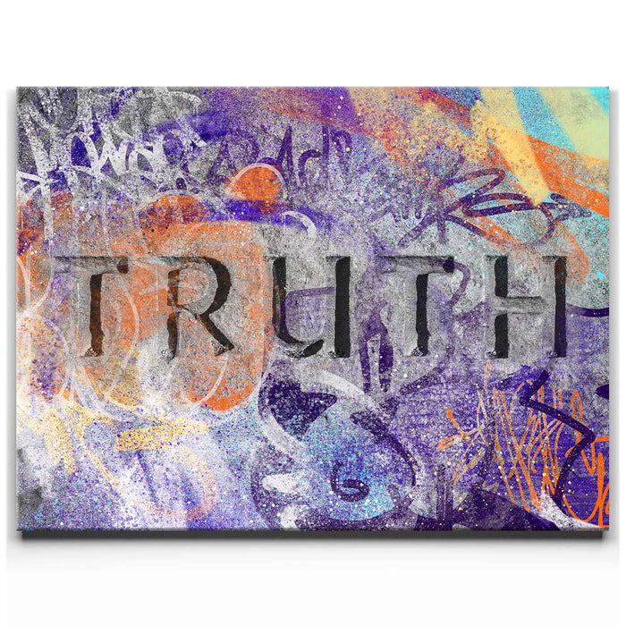 "Truth Stone - Graffiti" bursts into life with vibrant colors, blending the timeless solidity of the carved "Truth" with dynamic graffiti strokes. This mixed-media artwork juxtaposes the permanence of stone with the fleeting energy of street art, layered in shades of blue, yellow, and purple for a striking visual effect.