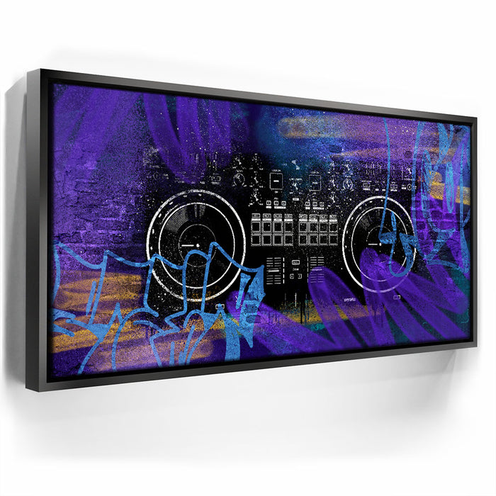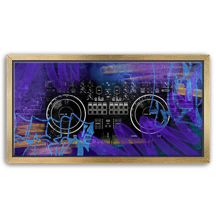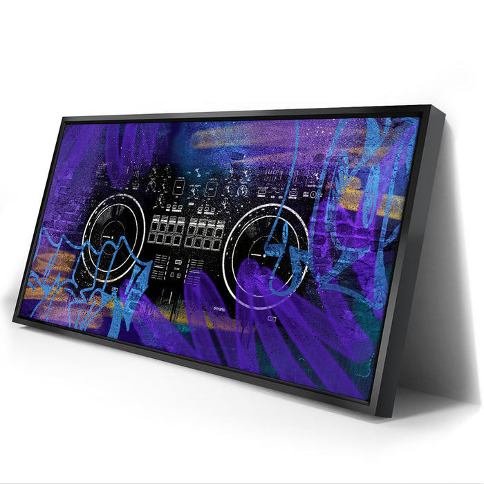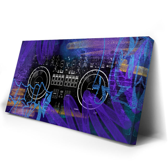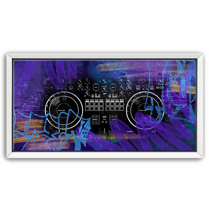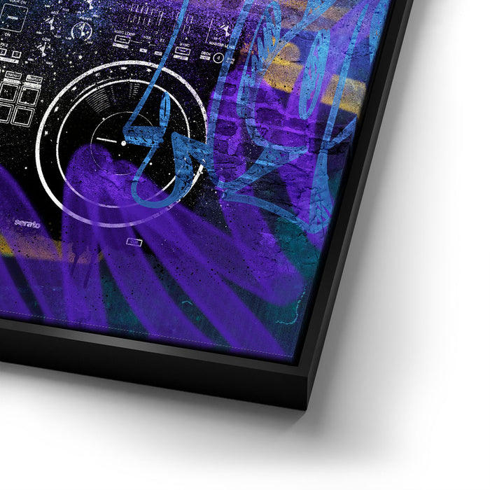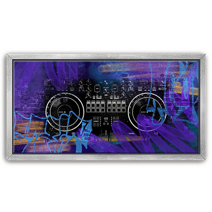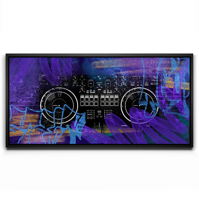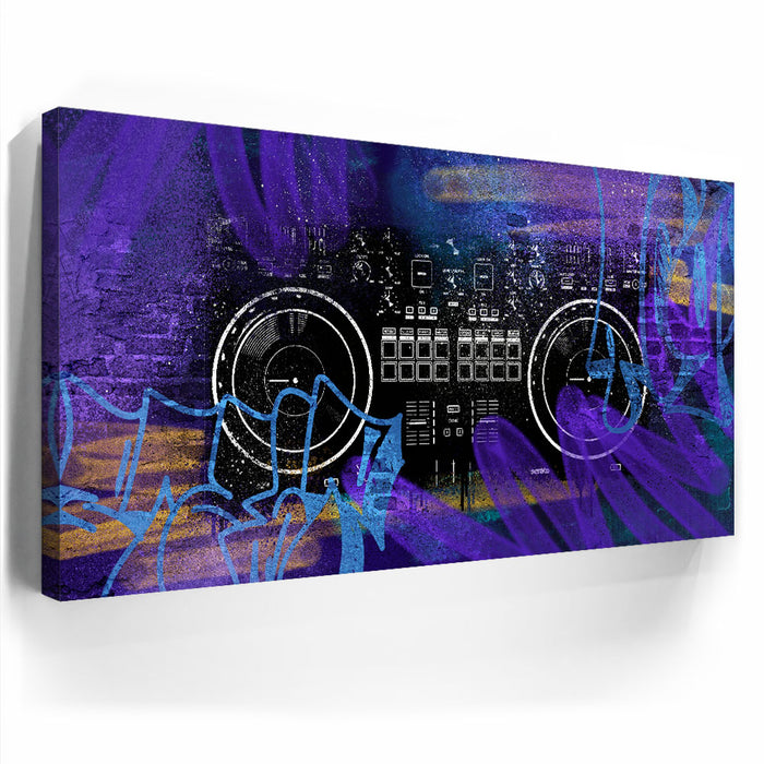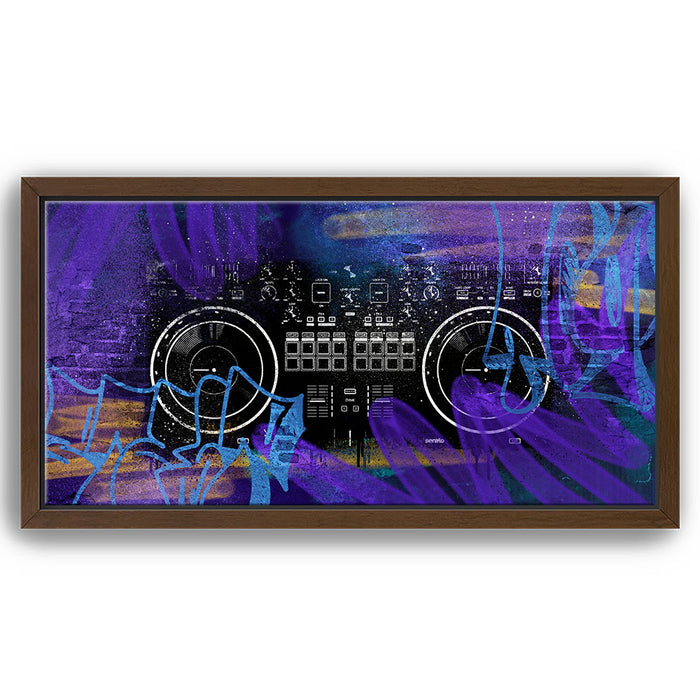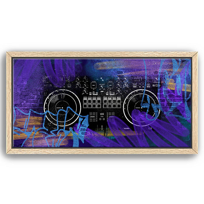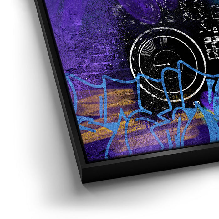 "Turntable - Retro Graffiti" fuses vintage music culture with bold urban graffiti, creating a vibrant tribute to the DJ era. Featuring a classic turntable surrounded by dynamic sprays of purple and blue graffiti, this piece embodies the rhythm and energy of street art and retro music.