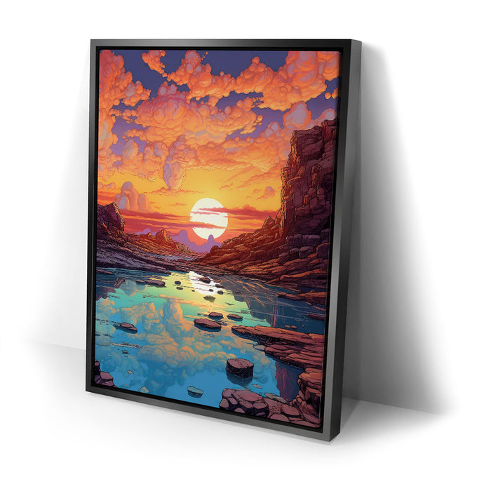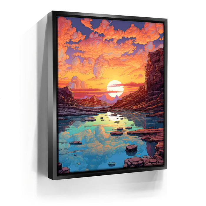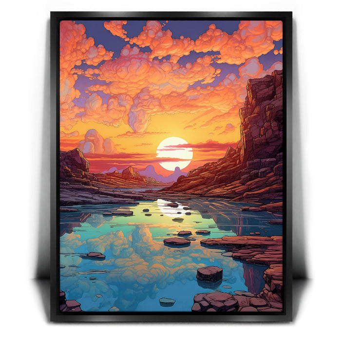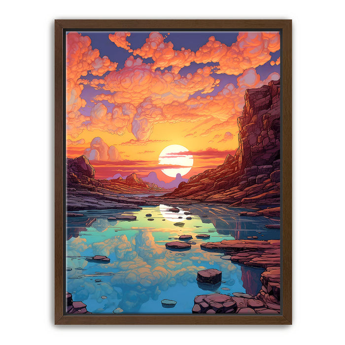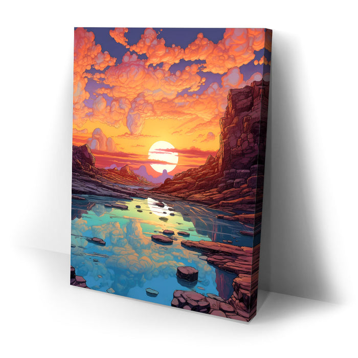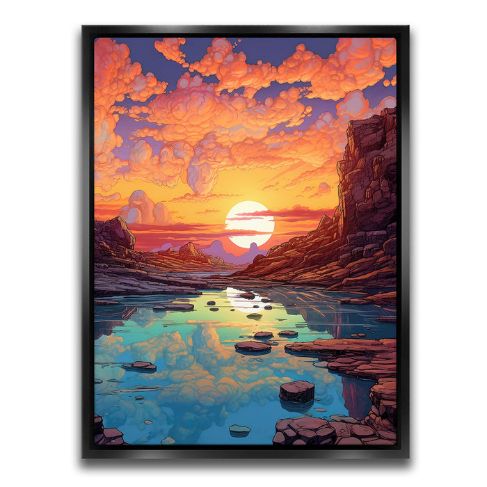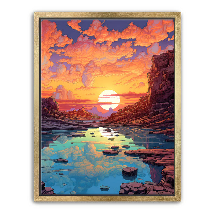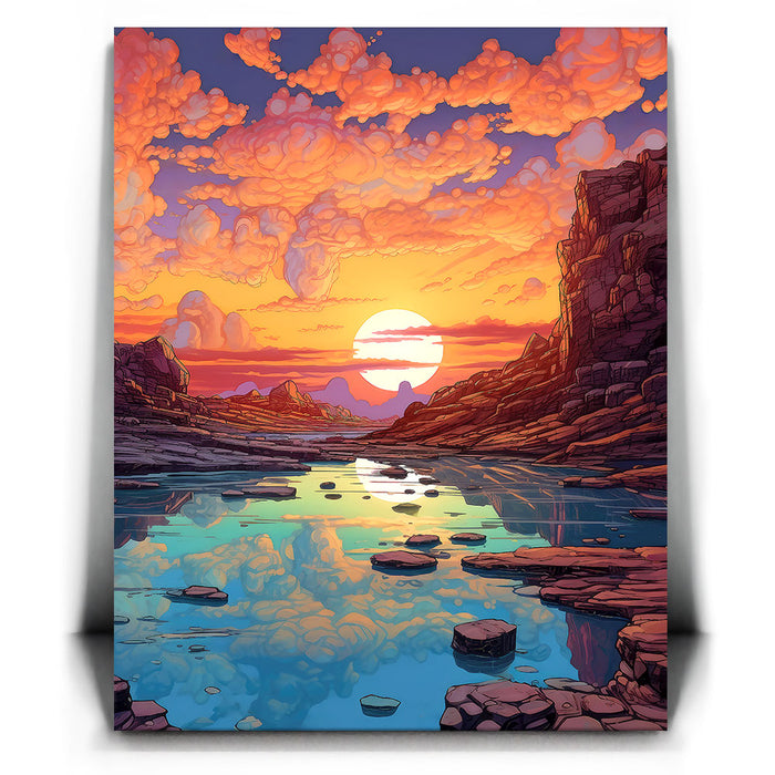 "Twilight Oasis" by Midjourney.Man presents a serene and dreamlike landscape, where the vibrant colors of the sunset reflect across calm waters. The sky is ablaze with orange, pink, and purple clouds, mirrored perfectly in the still water below, creating a sense of balance and tranquility. Rocky cliffs frame the scene, their warm tones bathed in the fading light of the setting sun, as distant mountains add depth to the horizon.