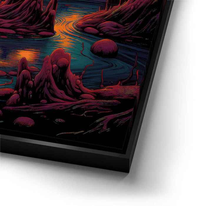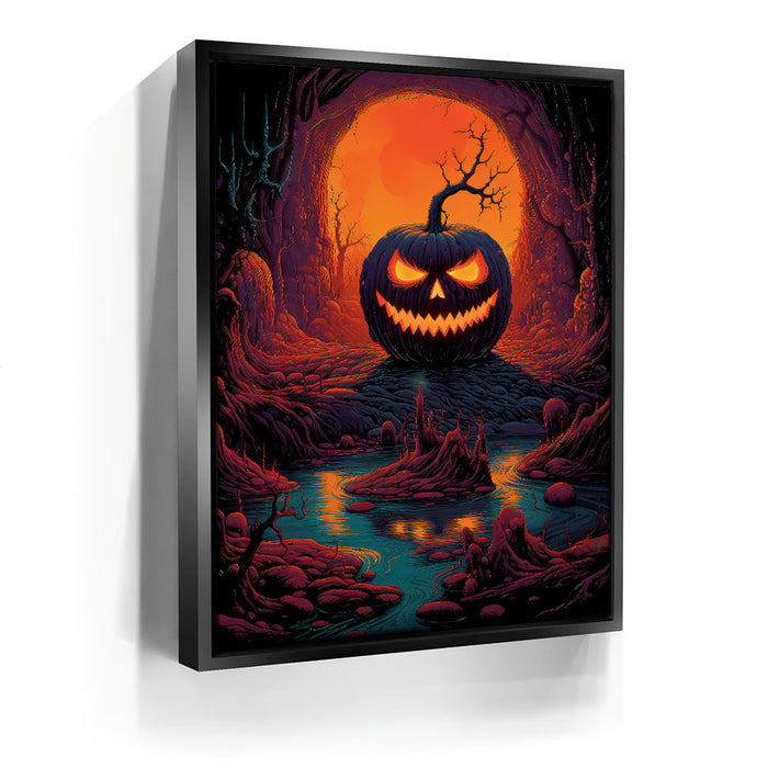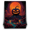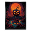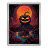 "Twilight Pumpkin" by Midjourney.Man is a hauntingly vibrant depiction of a menacing jack-o'-lantern set in an eerie, otherworldly landscape. The glowing orange eyes and jagged smile of the pumpkin create an unsettling focal point, as the surrounding dark forest and twisted, barren trees add to the ominous atmosphere. The reflection of the glowing sunset on the water enhances the mood of mystery and darkness, making the scene feel both surreal and enchanting.