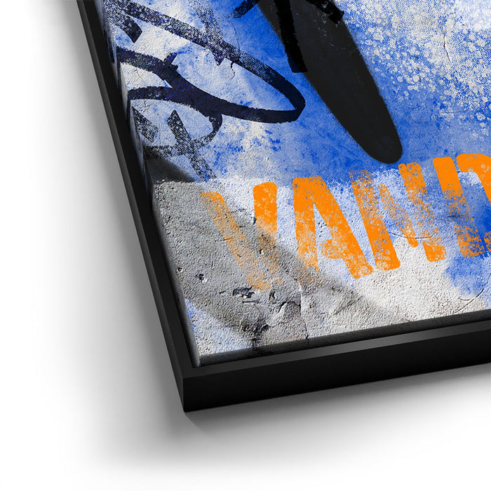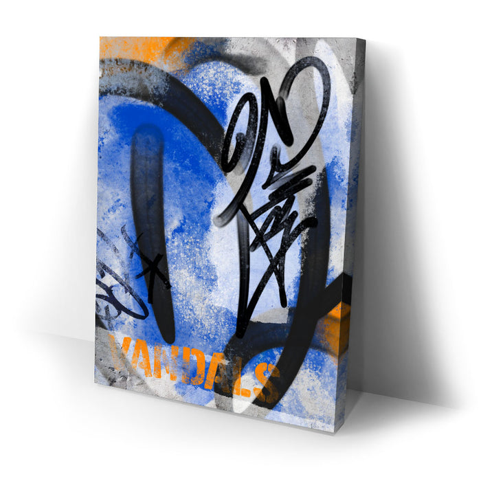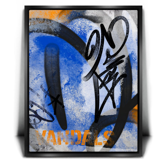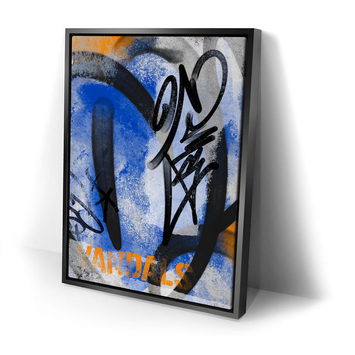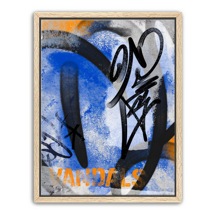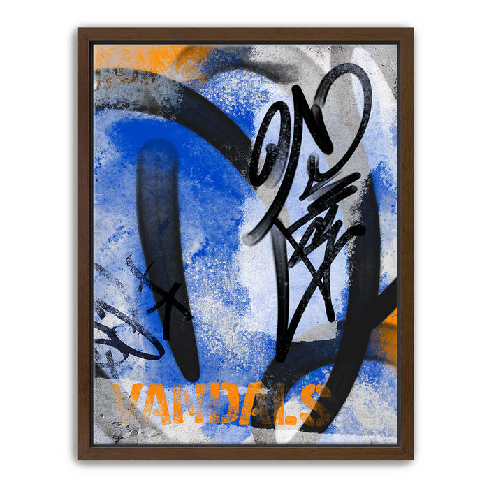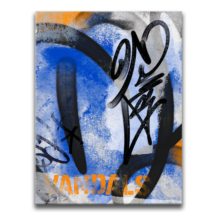 This bold and dynamic artwork, titled "Vandals - Graffiti," showcases the raw energy of street art through vibrant graffiti style. The piece features abstract shapes and tags in striking shades of blue, with the word "VANDALS" stenciled in a gritty, urban font.