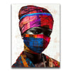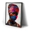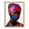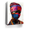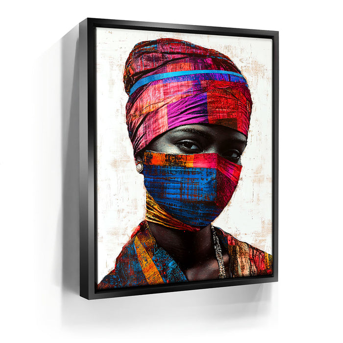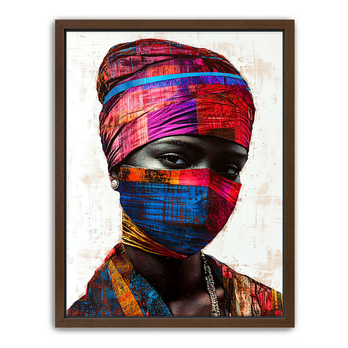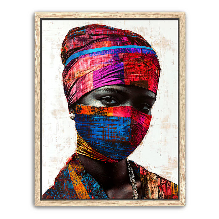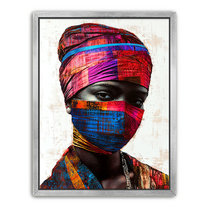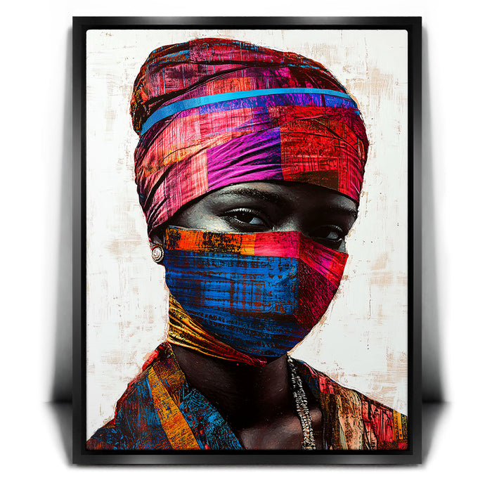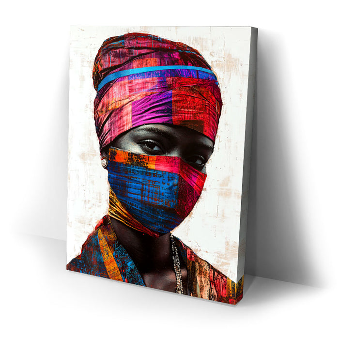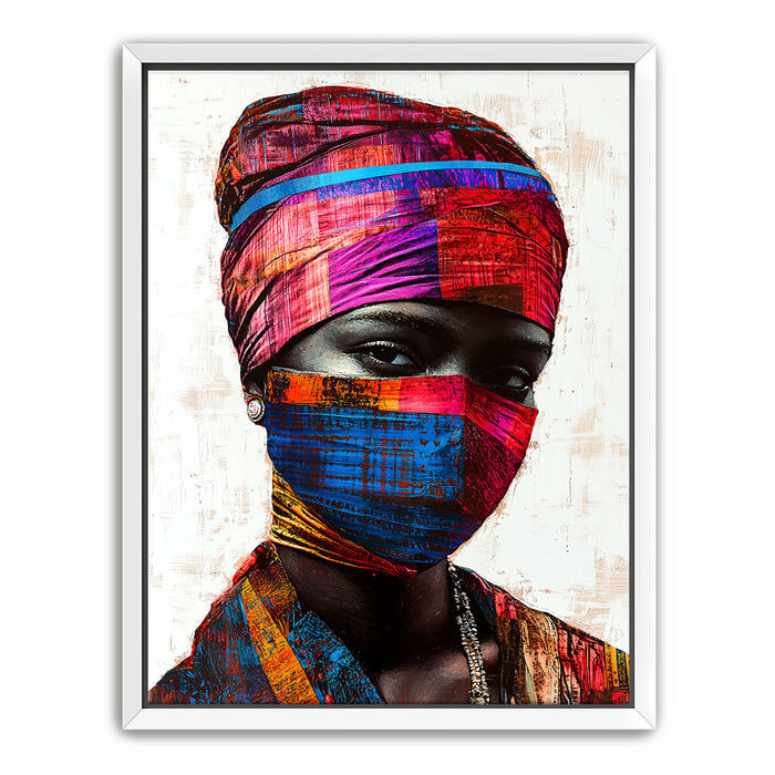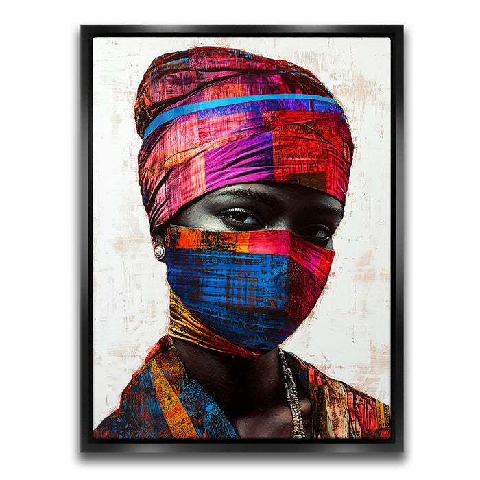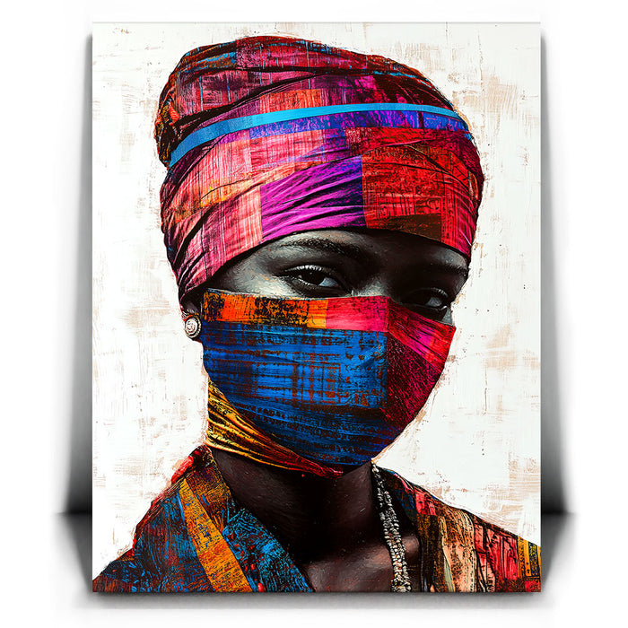 "Vibrance in Silence" by Kandise King is a mesmerizing portrait that celebrates cultural identity and resilience. This striking artwork features a figure adorned in vividly patterned headwraps and a matching face covering, set against a minimalist background that highlights the vibrant hues of red, blue, and gold. The intense gaze of the subject conveys strength, mystery, and quiet defiance.