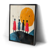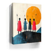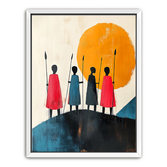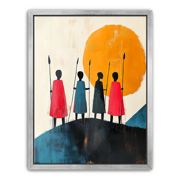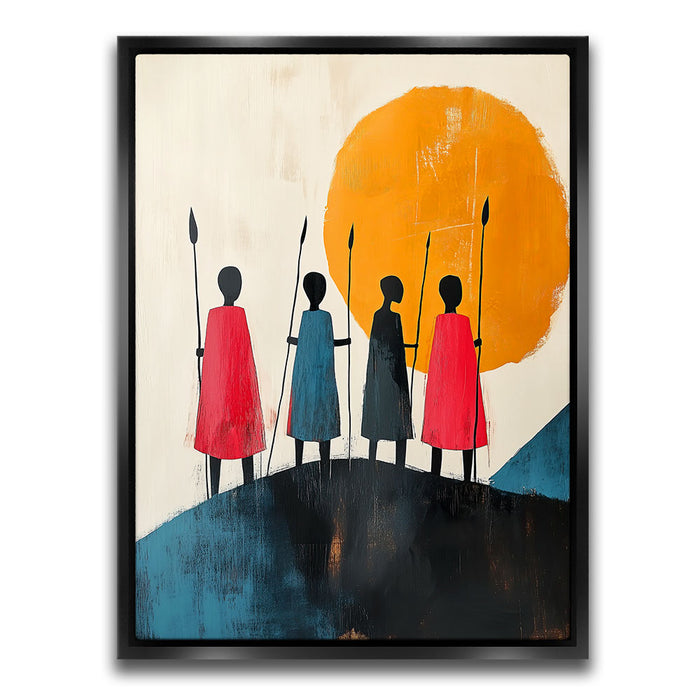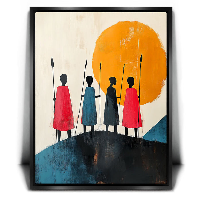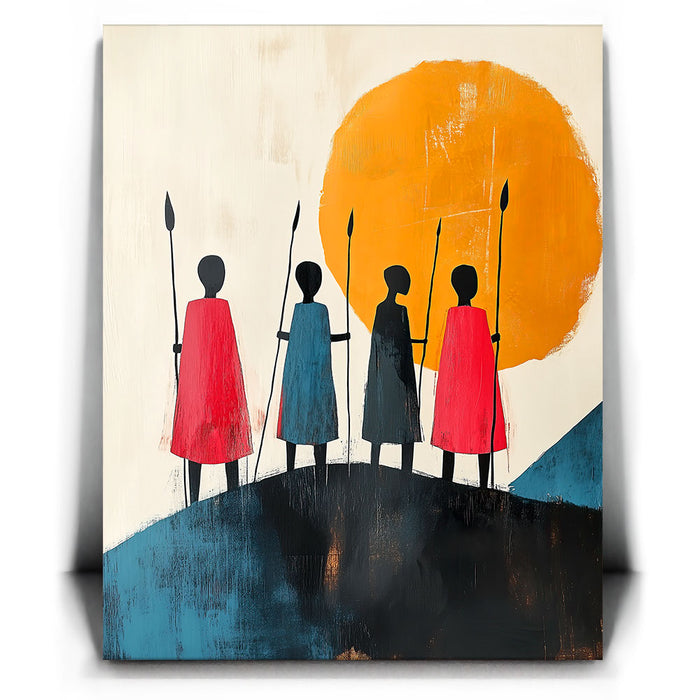 "Warriors of the Sun Path" by Kandise King is a bold and minimalist composition that captures the essence of unity, strength, and tradition. Featuring silhouetted figures holding spears, draped in vivid red and blue cloaks, they stand against the backdrop of a striking, golden sun. The artwork exudes a sense of resilience and honor, drawing from themes of heritage and cultural pride.