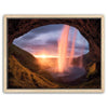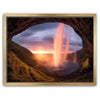 "Waterfall On Fire" by photographer Marcin Zajac captures the breathtaking beauty of nature as sunlight streams through a cascading waterfall, creating an ethereal fiery glow. This stunning landscape photograph highlights the interplay of light and water, set against the dramatic backdrop of lush greenery and rugged cliffs.