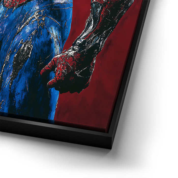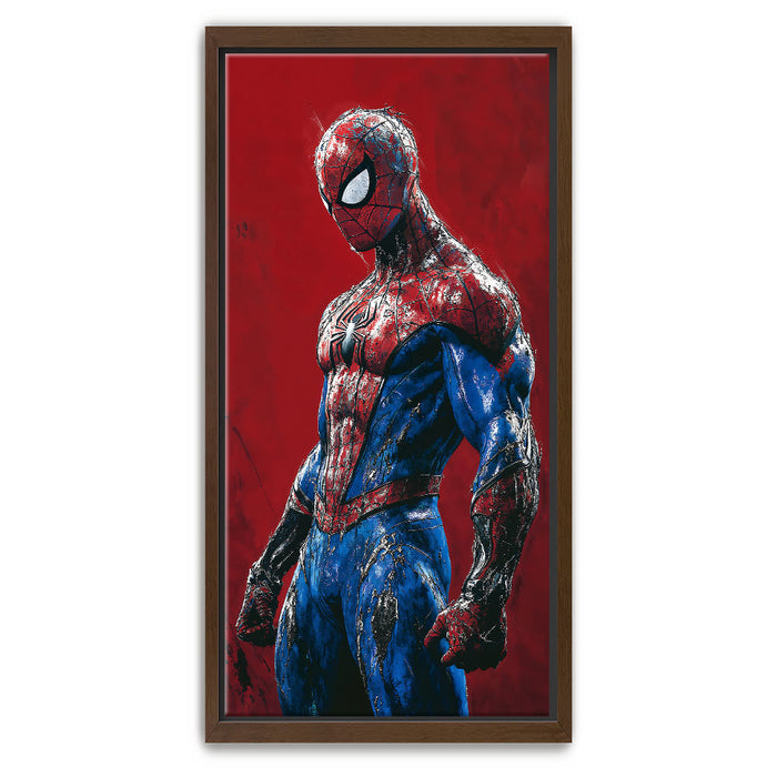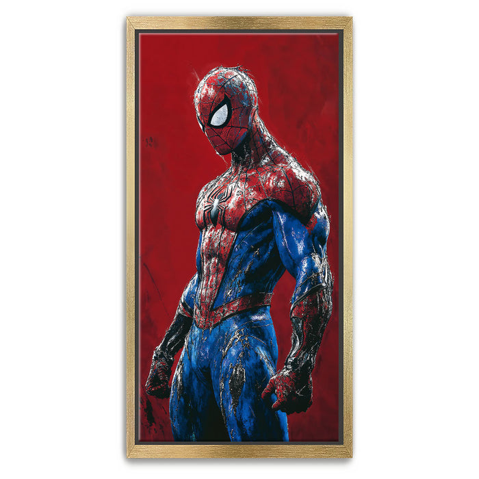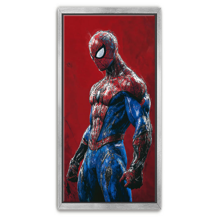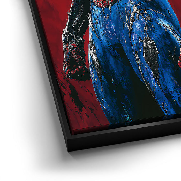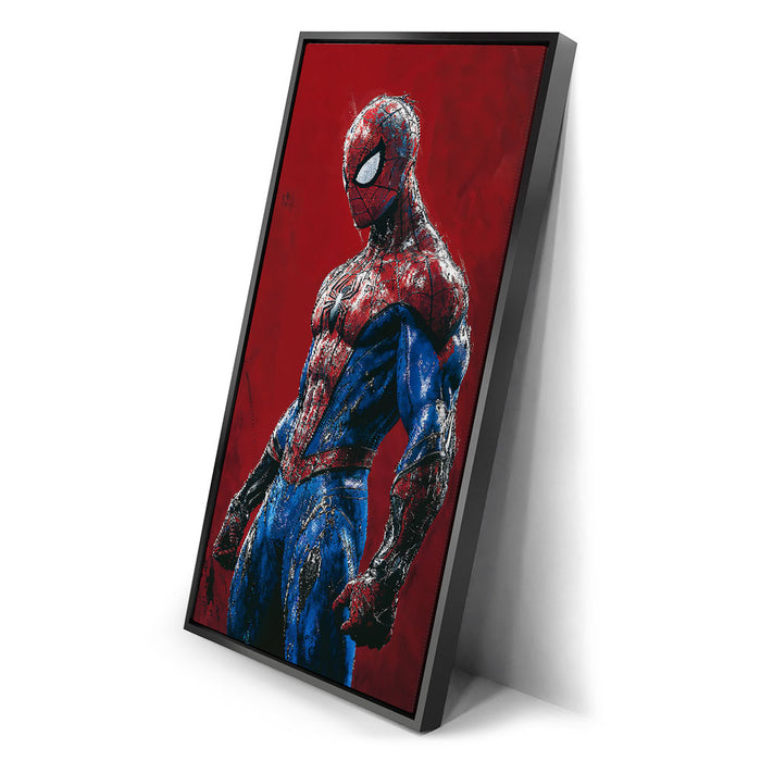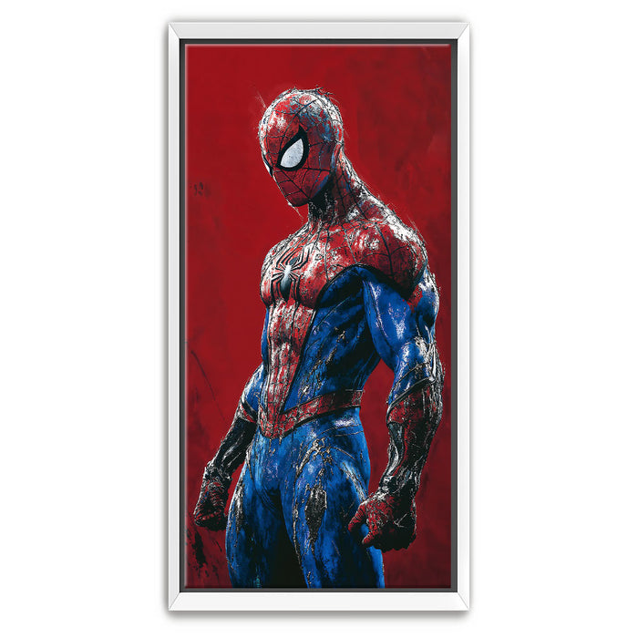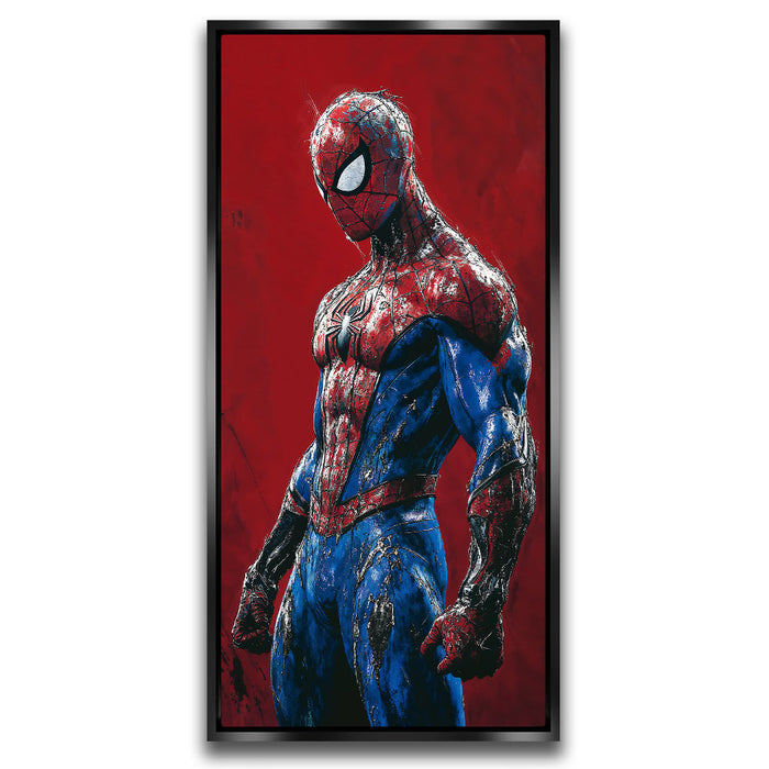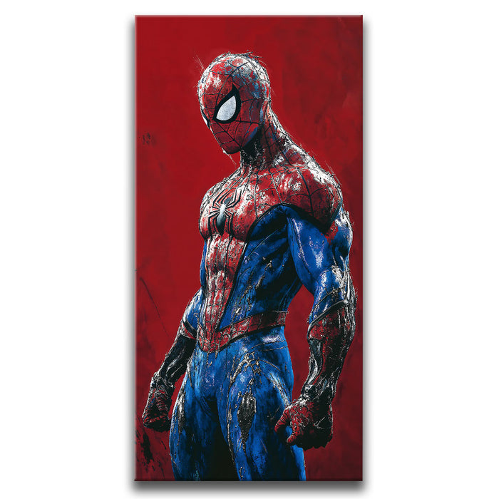 "Web of War" captures the iconic superhero in a powerful, battle-worn stance, showcasing the gritty resilience and strength of the character. With his suit torn and bruised against a striking red background, this artwork emphasizes the hero's relentless spirit in the face of adversity. Perfect for fans of comic book art, this piece blends intense detail with a raw, dramatic aesthetic, making it an ideal addition to any collection dedicated to action and heroism.