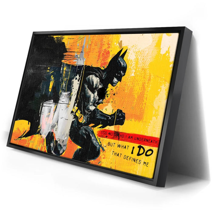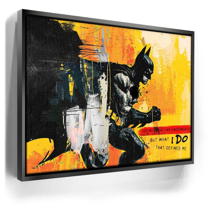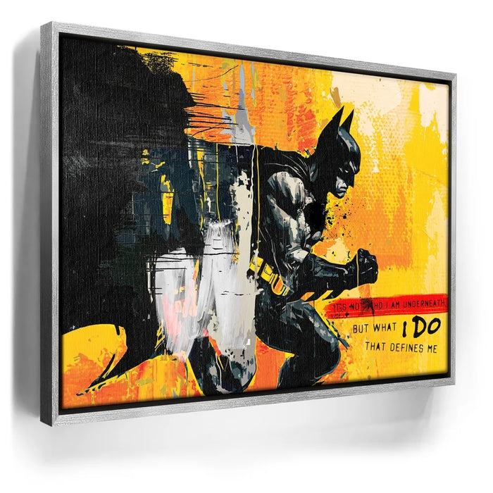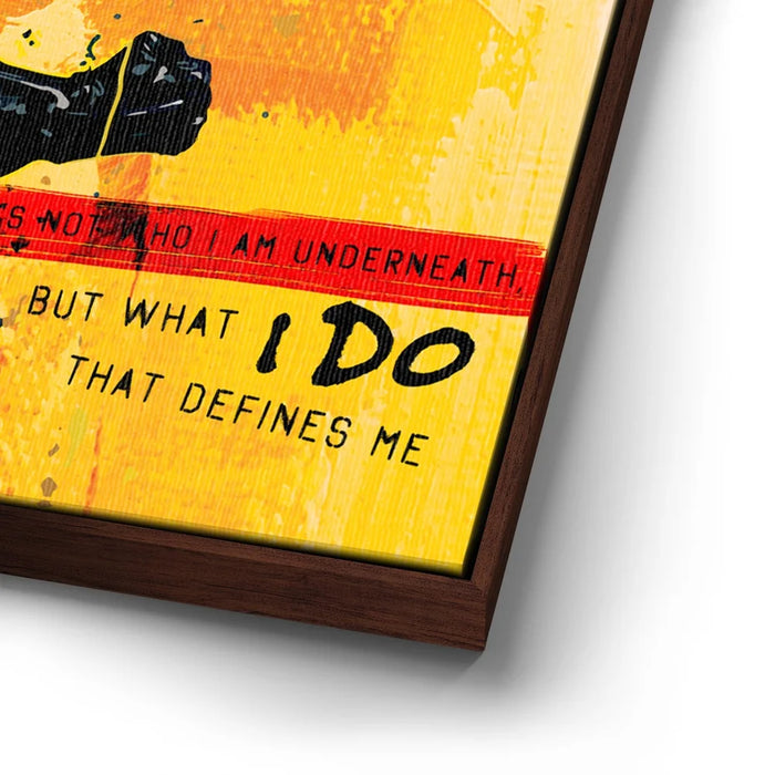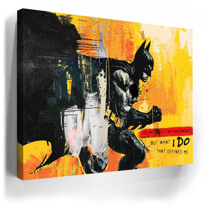 What I Do Defines Me captures the strength and determination of an iconic hero through bold street art style. With striking black and yellow contrasts, dynamic brush strokes, and the powerful quote, “It’s not who I am underneath, but what I do that defines me,” this artwork blends comic book energy with urban edge.