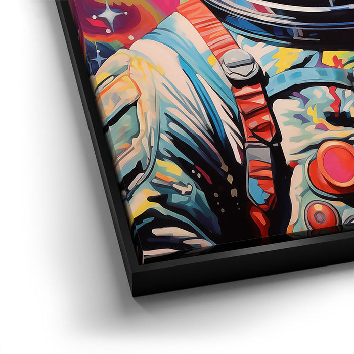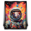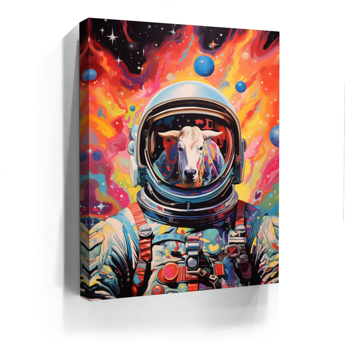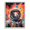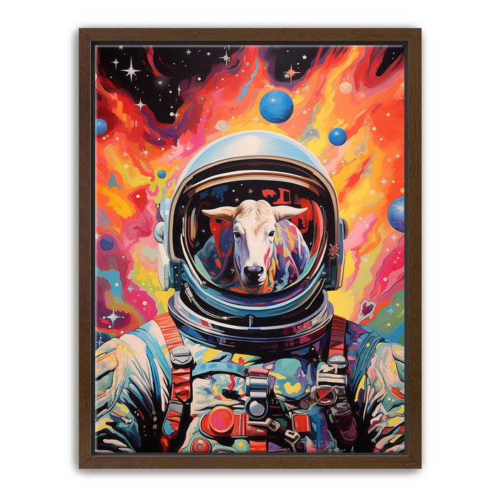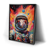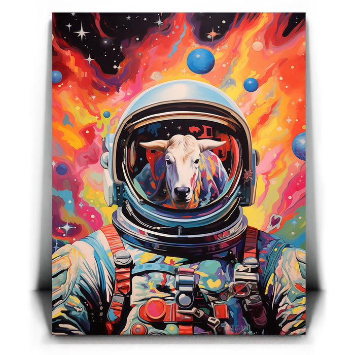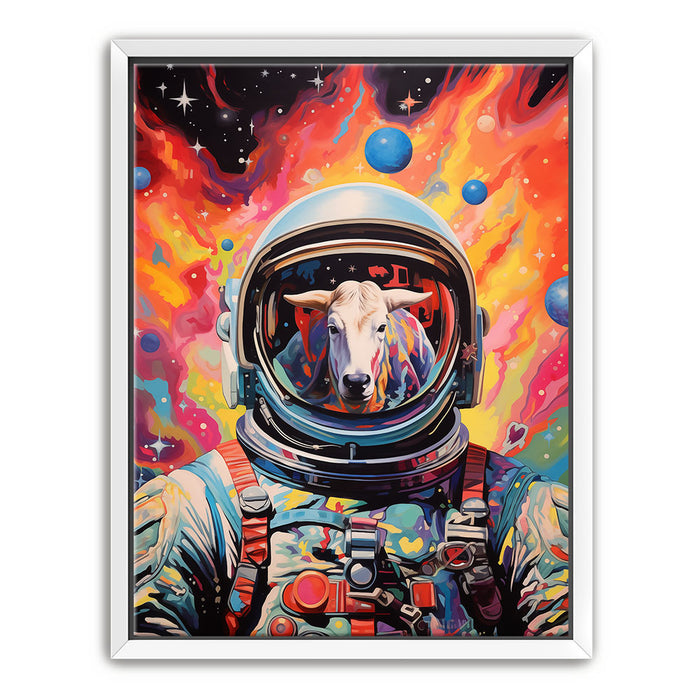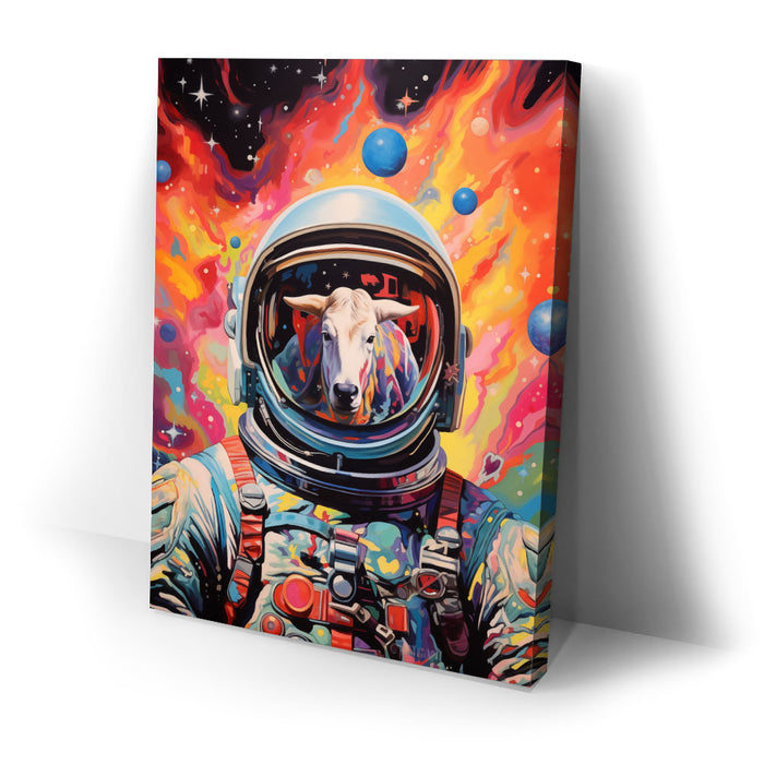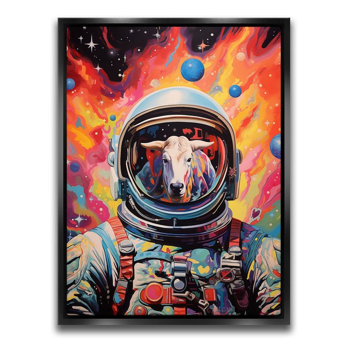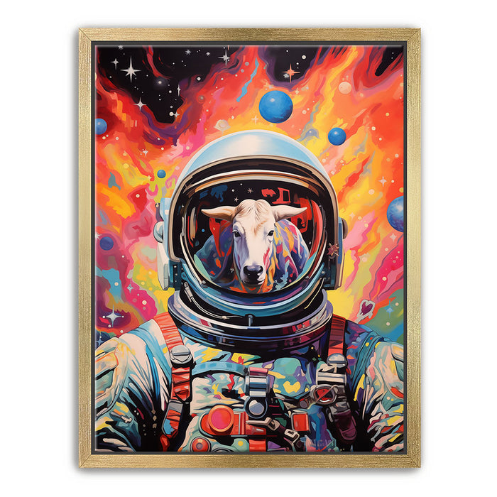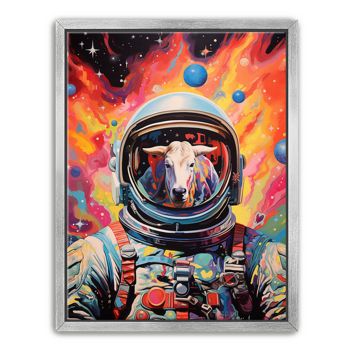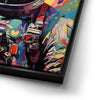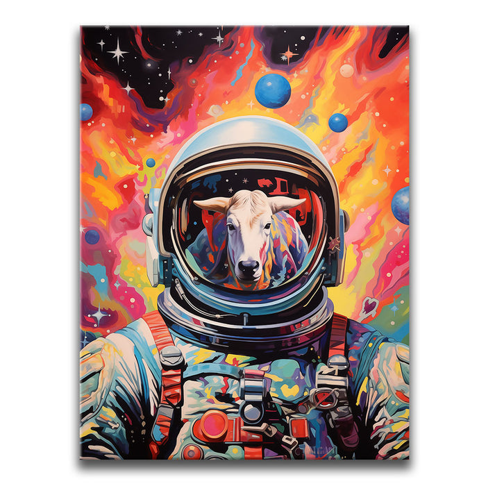 "What I See" by Sean Pearce is a colorful abstract portrait that merges the wild spirit of zoo animals with the imaginative vastness of outer space. Featuring a goat in a cowboy hat surrounded by vibrant cosmic elements, this surreal piece blends the wild west, outer space, and animal motifs into one bold, expressive composition.