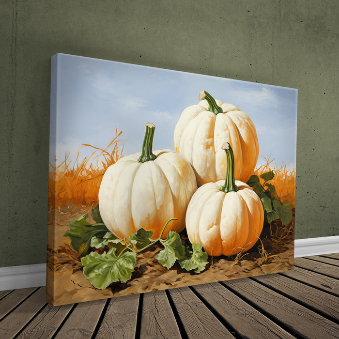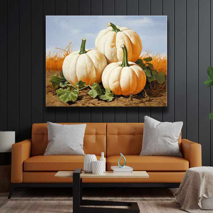 The subtle hues of white and earthy tones of fall leaves evoke a sense of tranquility and warmth, making this artwork ideal for creating a cozy, seasonal atmosphere. Bring the beauty of the pumpkin patch and the spirit of autumn into your home with this stunning fall-inspired piece.