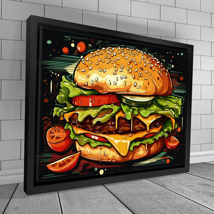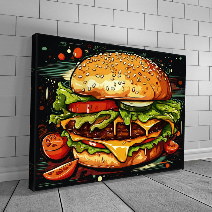 "You Had Me At Cheeseburger" by Merrillio is a playful and vibrant tribute to everyone's favorite comfort food. This colorful artwork features all the iconic elements of a classic cheeseburger, including a juicy patty, fresh lettuce, tomato, cucumber, mustard, and cheese, creating a deliciously eye-catching design.