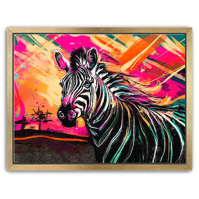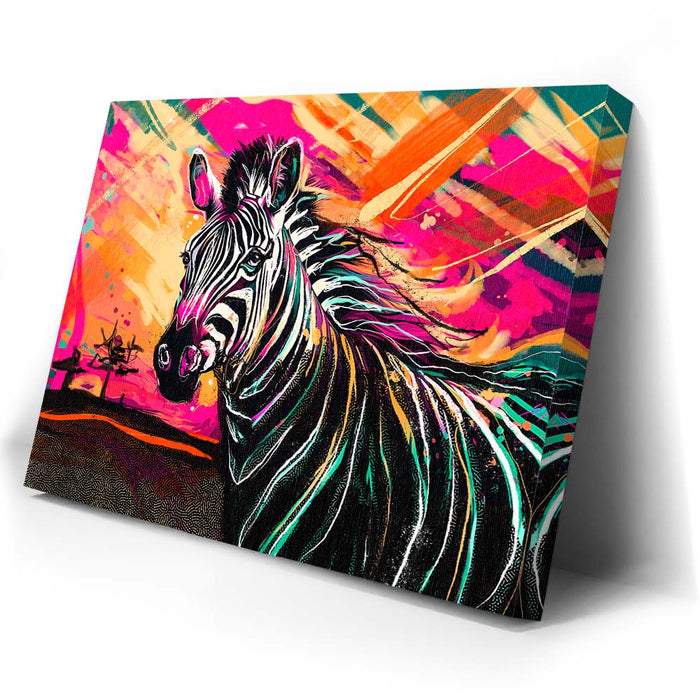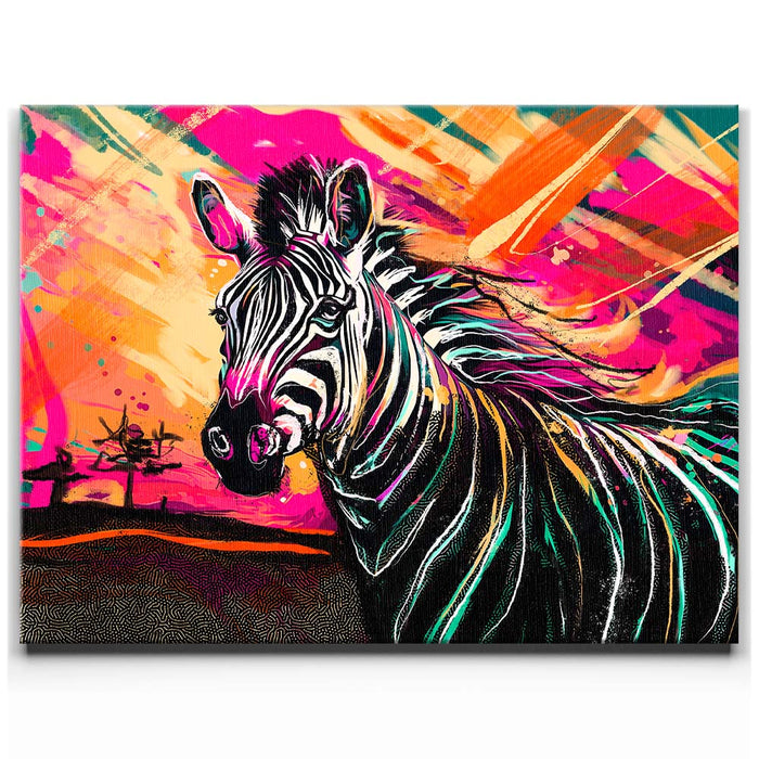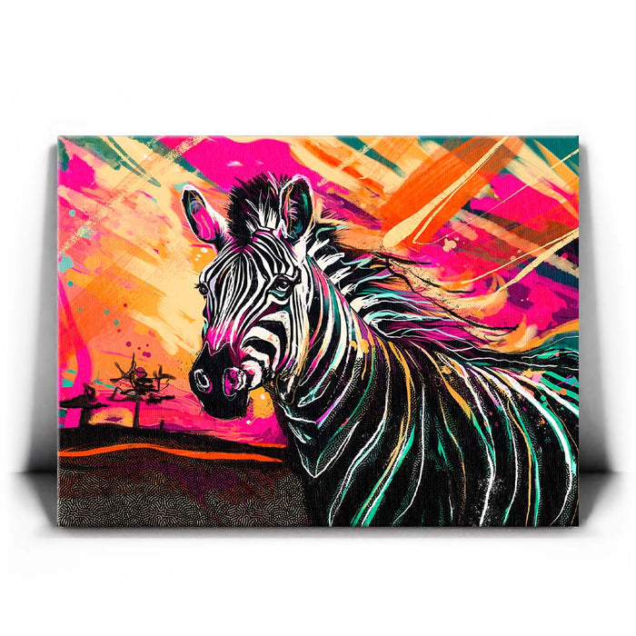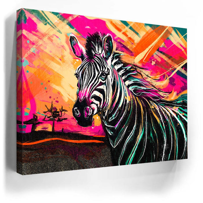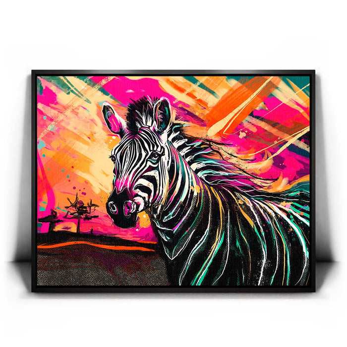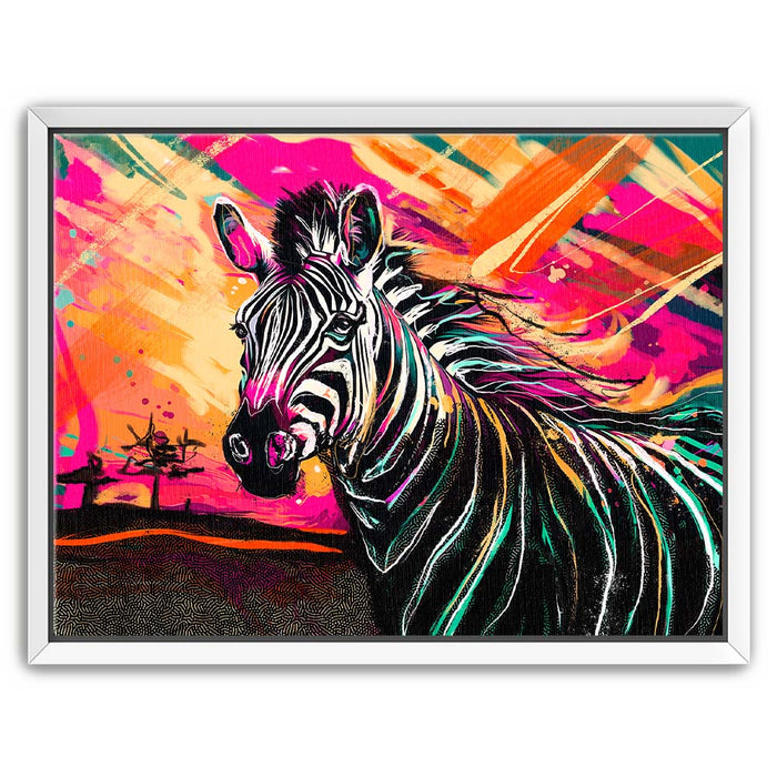 This vibrant artwork titled "Zebra Sunset" captures the essence of the wild with a striking depiction of a zebra against a colorful, abstract background. The zebra, with its classic black and white stripes, stands out beautifully against a sunset filled with bold, vibrant colors, adding an exotic touch to the piece. The blend of pinks, oranges, and yellows enhances the zebra's natural beauty, creating a visually stunning composition that celebrates the majesty of wild animals in a modern, colorful style.