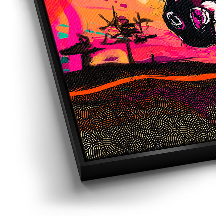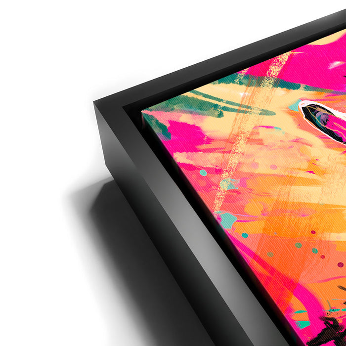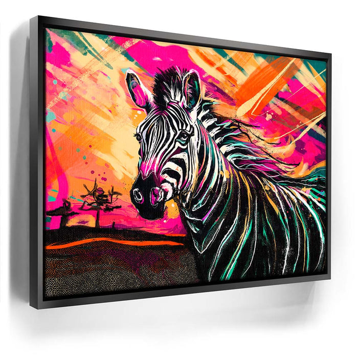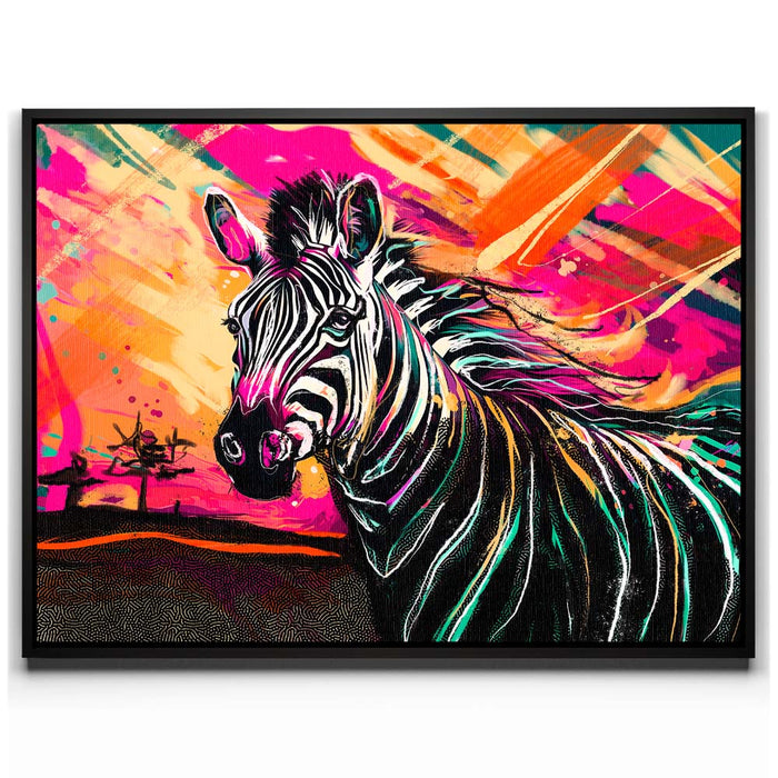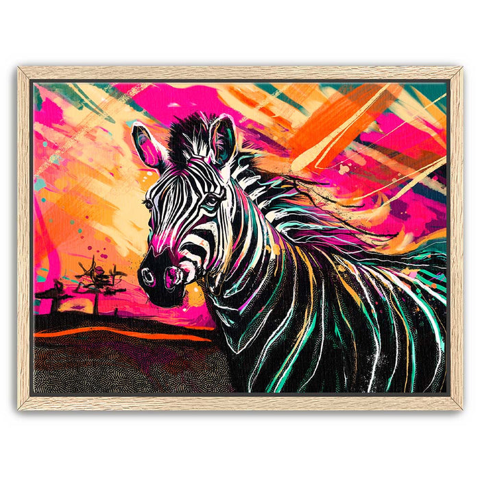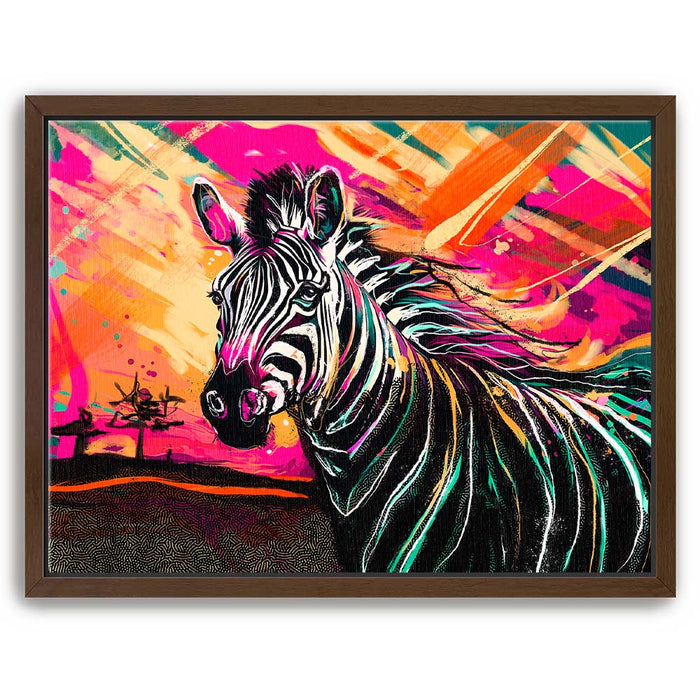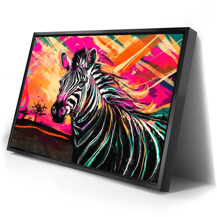 This vibrant artwork titled "Zebra Sunset" captures the essence of the wild with a striking depiction of a zebra against a colorful, abstract background. The zebra, with its classic black and white stripes, stands out beautifully against a sunset filled with bold, vibrant colors, adding an exotic touch to the piece. The blend of pinks, oranges, and yellows enhances the zebra's natural beauty, creating a visually stunning composition that celebrates the majesty of wild animals in a modern, colorful style.