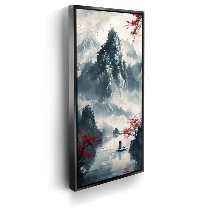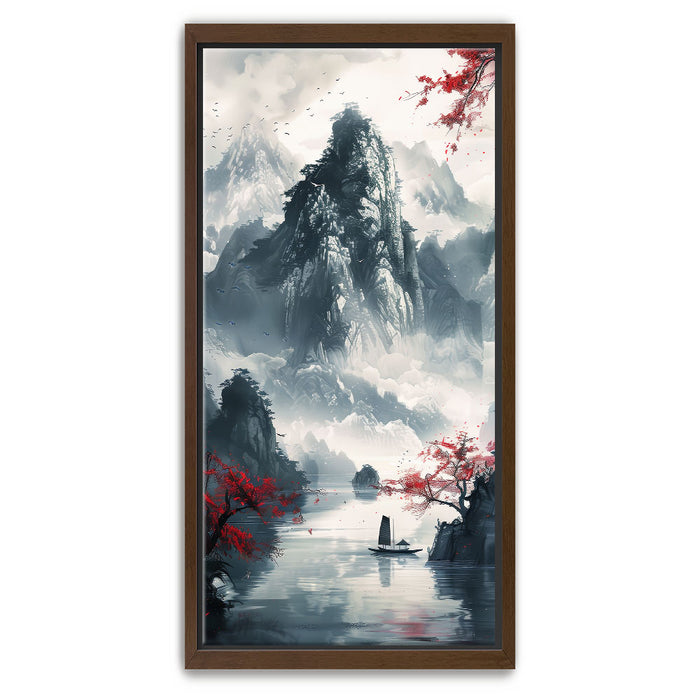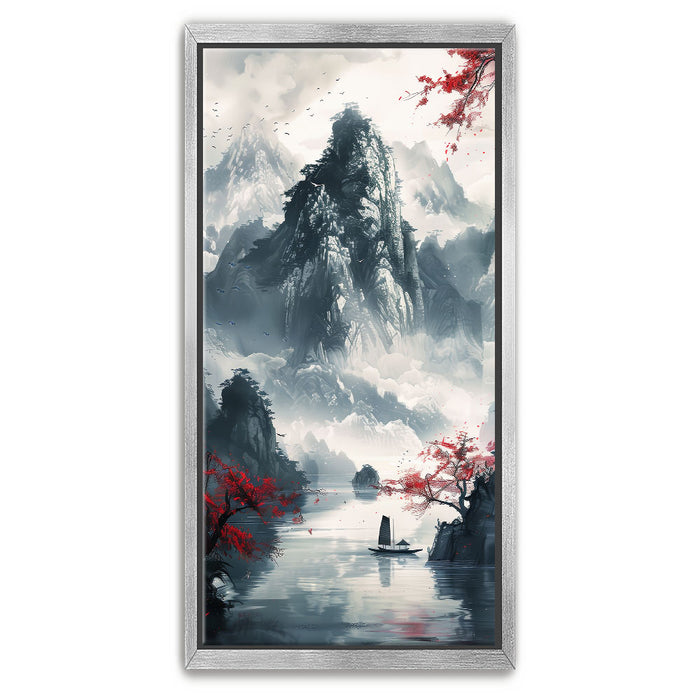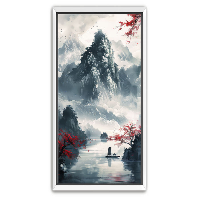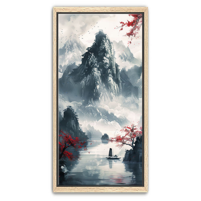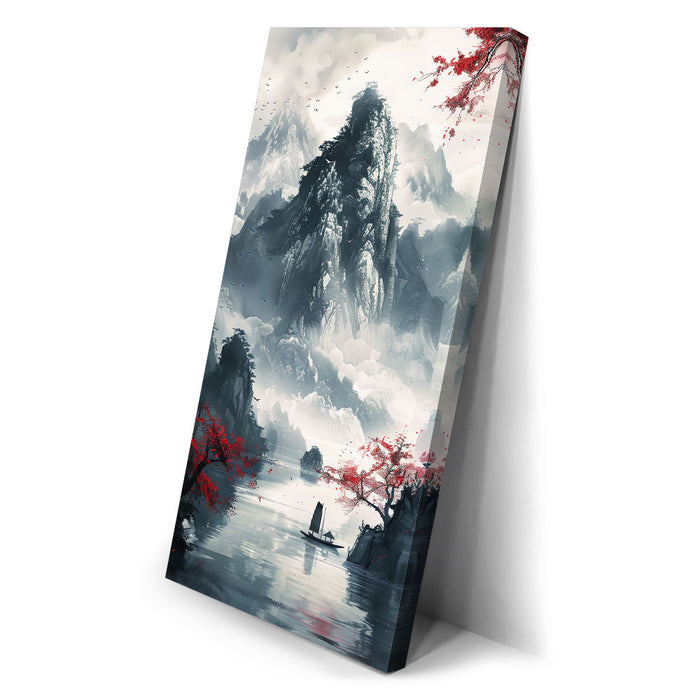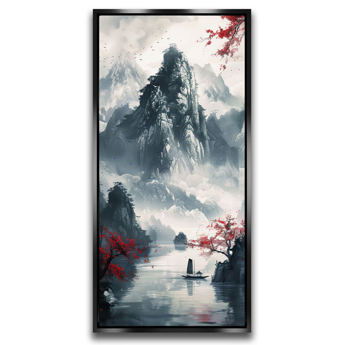 "Zen Mountain" by Arend Pryor is a tranquil abstract artwork that captures the serene beauty of foggy mountains, calm water, and a peaceful sailboat drifting through a misty valley. This piece evokes a sense of balance and stillness, blending elements of Zen, nature, and minimalism. With soft tones and layered textures, it reflects the harmony of mountain peaks, rivers, trees, and birds in flight.