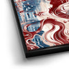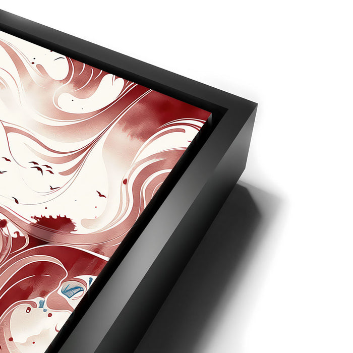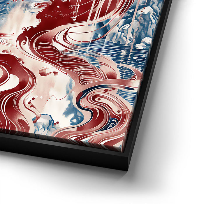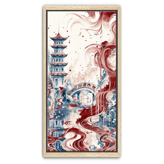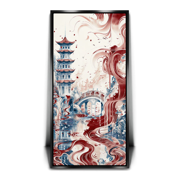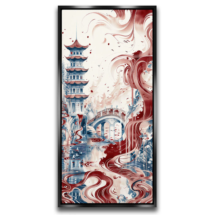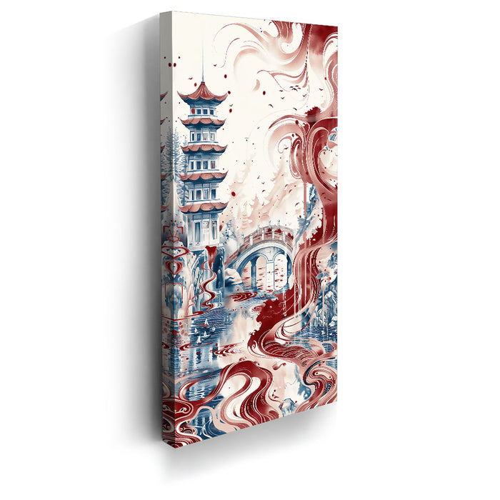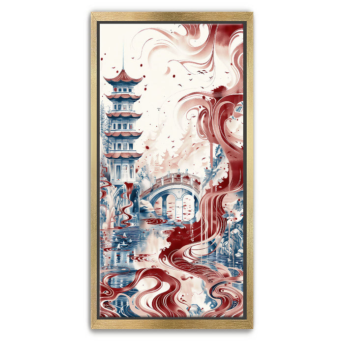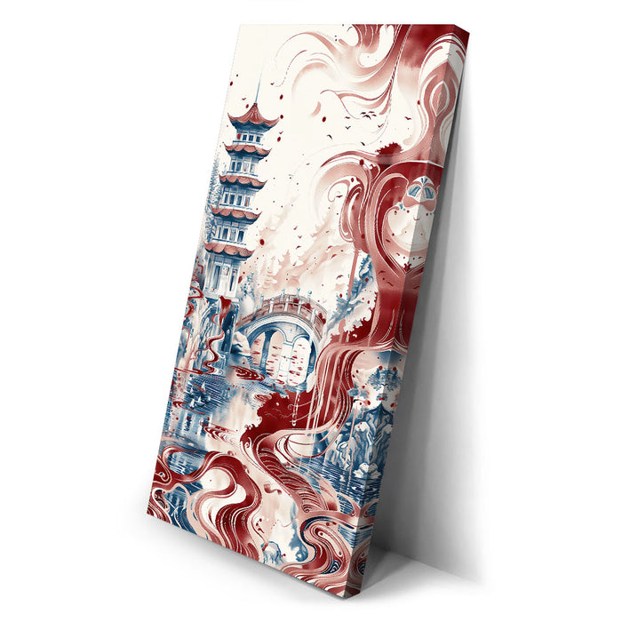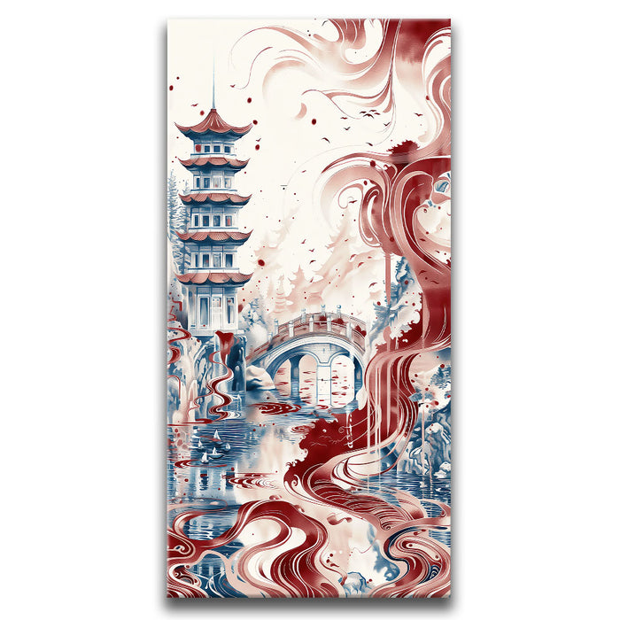 "Zen Reflections" by Stella Ygris invites viewers into a tranquil world of serene beauty and harmonious design. This masterpiece showcases a traditional pagoda and an arched bridge amidst a flowing, ethereal landscape of red and blue hues. The swirling elements mirror water and wind, evoking a sense of balance and calm that is central to Zen philosophy.